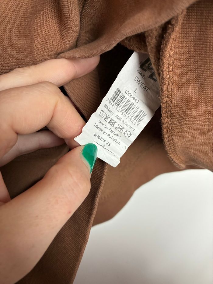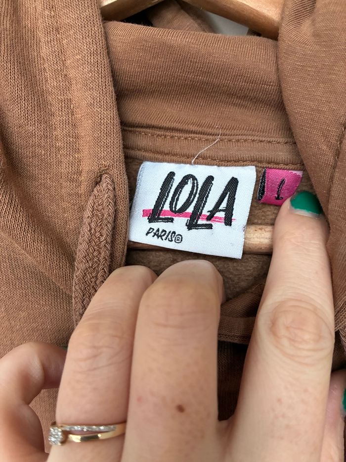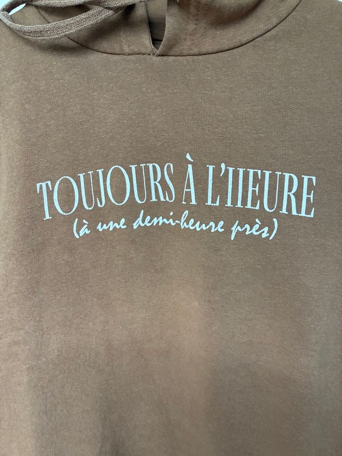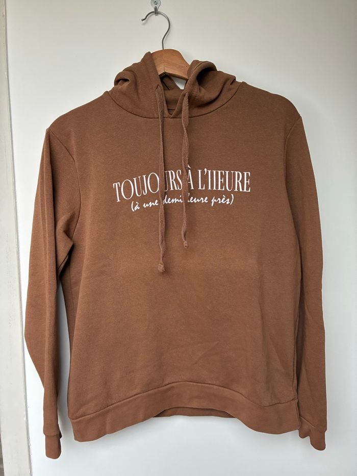 Sweat-shirt à capuche marque Lola, taille L, couleur marron, avec message blanc original : “Toujours à l’heure (à une demi-heure près)” ✔️ Matière douce et agréable ✔️ Coupe confortable ✔️ Style casual / cocooning ✔️ Message fun et tendance ➡️ Bon état, aucun défaut notable ➡️ Taille L – convient aussi pour un look oversize ➡️ Envoi rapide