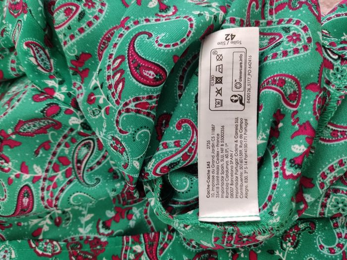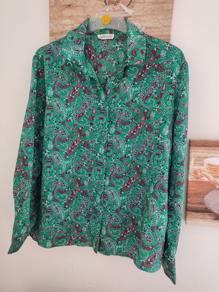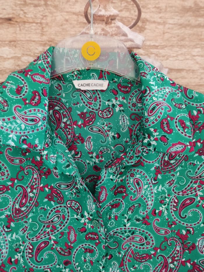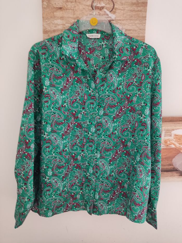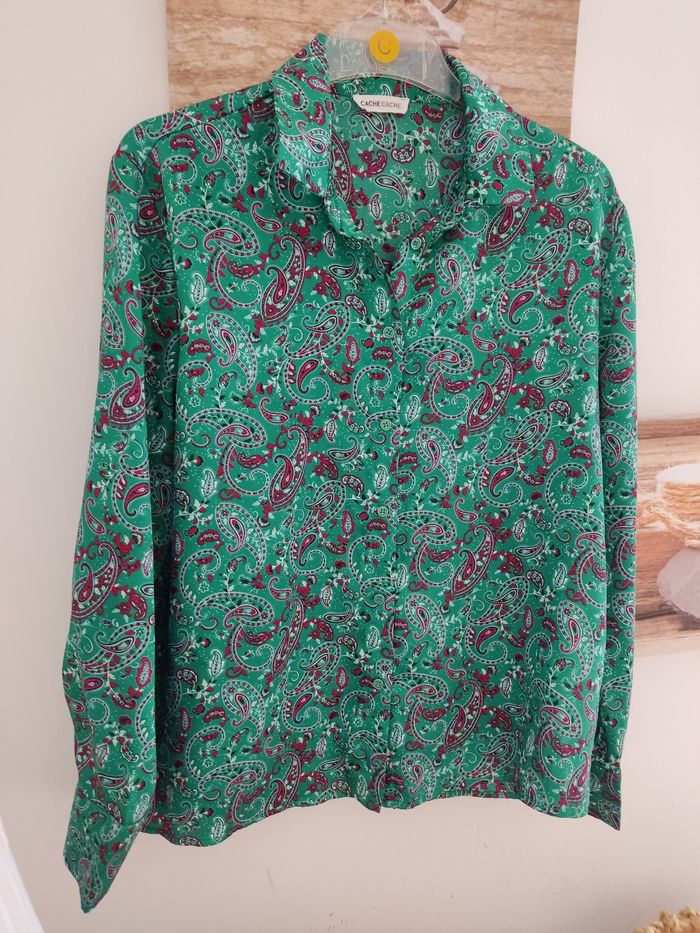 Chemisier vert imprimé fleurs. Cache cache. Taille 42. Largeur aisselle à aisselle : 56 cm. Composition : polyester. Neuf