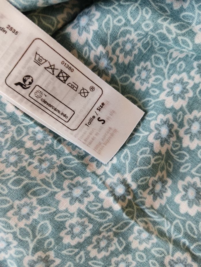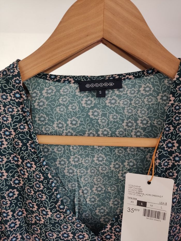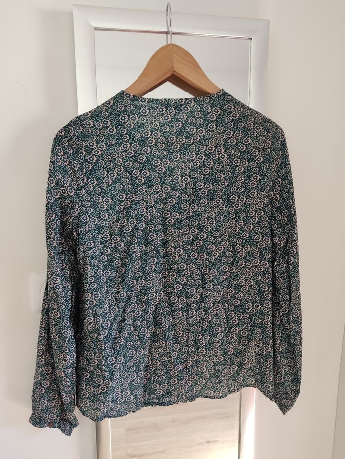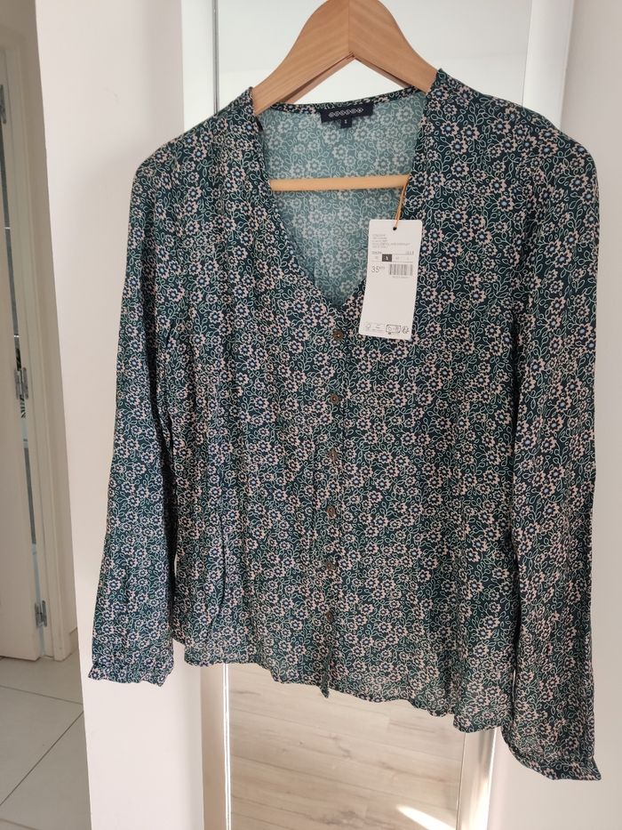 Chemisier vert imprimé fleurs. Bonobo. Taille S. Largeur aisselle à aisselle : 46 cm. Composition : viscose. Neuf avec étiquette