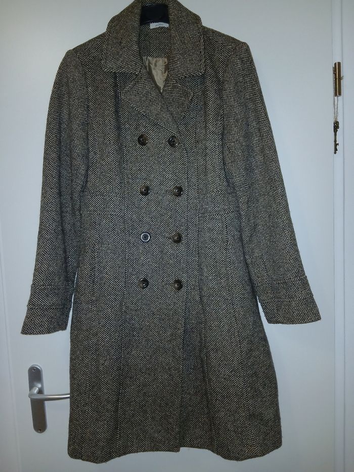 Manteau avec coupe cîntrée en laine, poche de chaque côté,3 boutons et 3 autres décoratifs, moucheté noir blanc marron et petites quantités de vert et orange