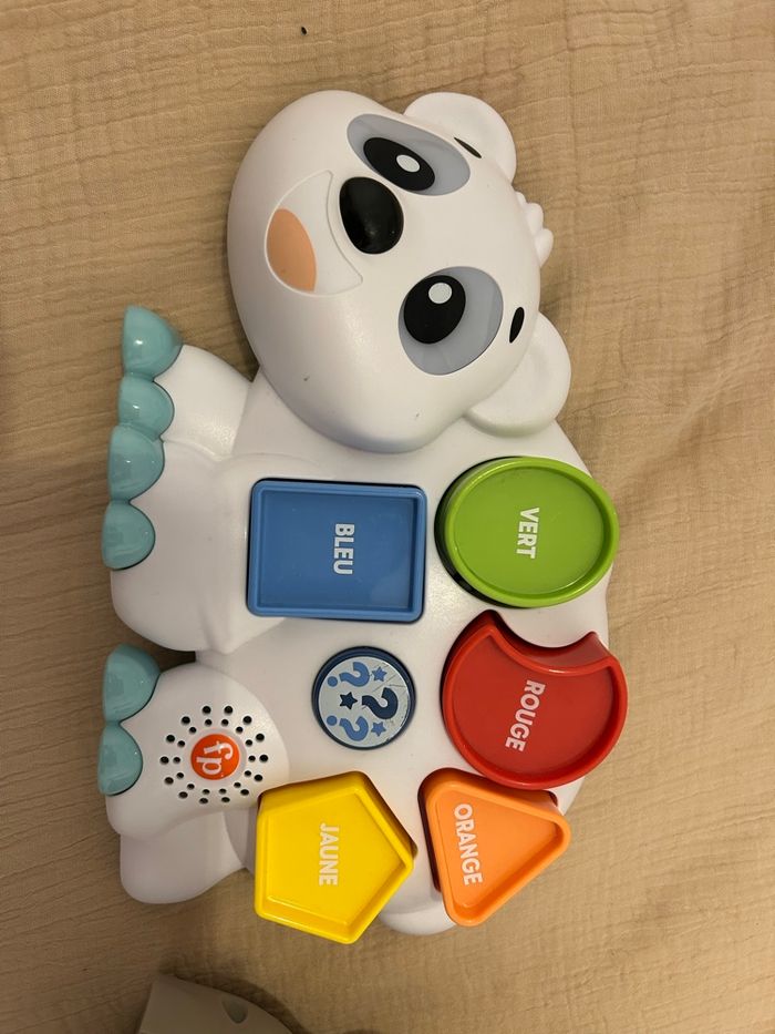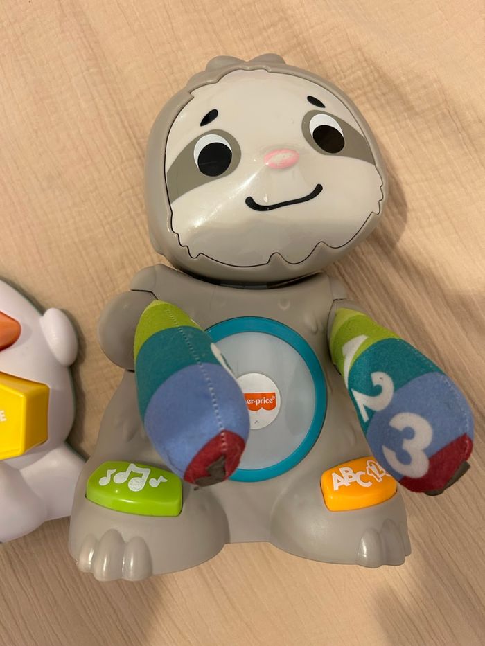 Lot de 2 animaux Linkymals qui communiquent entre eux • Omer l’ours polaire avec formes à encastrer et chiffres (le bouton est un peu griffé: photo) • Matthieu le paresseux interactif avec chansons, couleurs et chiffres (son bout du nez est un peu abîmé et il y a 2 traits derrière sa tête: photos) Idéal pour l’éveil des bébés : apprentissage des formes, couleurs, chiffres et motricité fine. En très bon état, hormis les détails donnés dans l’annonce, parfaitement fonctionnels. J’ai dû retirer les piles car rechargeables. :) 💡 Vendus uniquement en lot. #jouetbebe #fisherprice #eveil #motricite #joueteducatif #bebe #jouetoccasion #paresseux #ourspolaire #formesaencastrer #apprentissage #123 #li