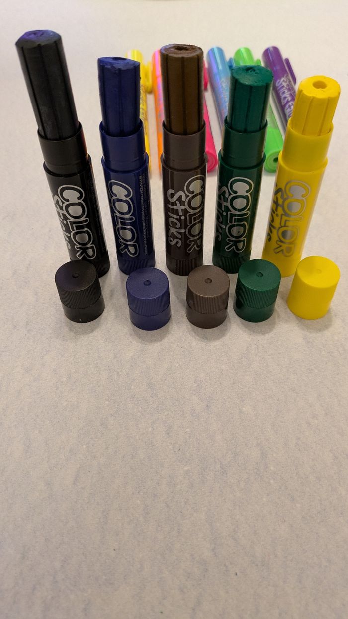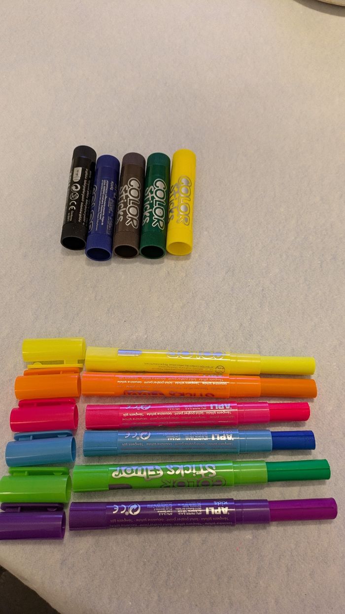 Bonjour, Vends lot de 11 sticks color peinture avec 5 color sticks peinture ( Vert, bleu, noir, jaune et marron ) et 6 color sticks fluo ( jaune, rose ,orange , bleu ,vert et violet ) en très bon état, à partir de 3 ans. Gouache solide en tube plastique facile à ouvrir et à utiliser . Ne tâche pas et séchage rapide ( en moins de 3 mn ).