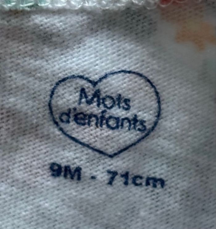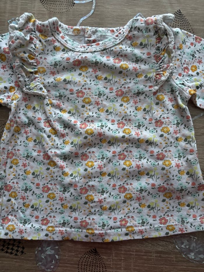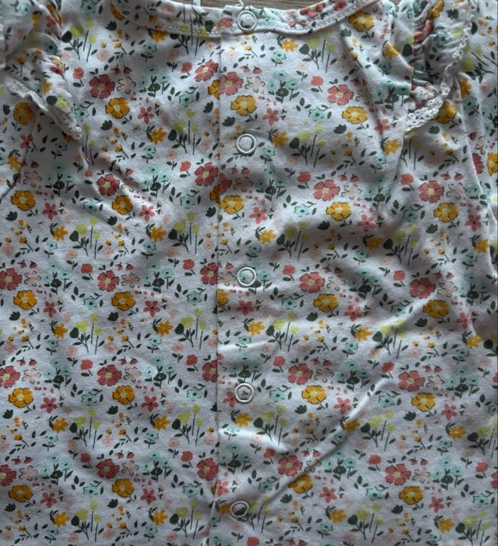 Très mignon haut imprimé fleuri, avec jolis volants aux épaules. Doux et confortable, en très bon état. Idéal pour le quotidien. Marque : Mots d’enfants Taille : 9 mois 71cm