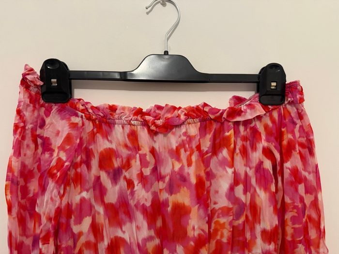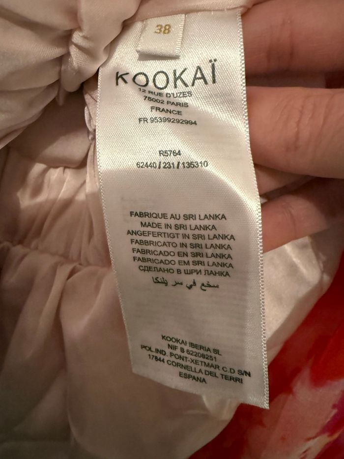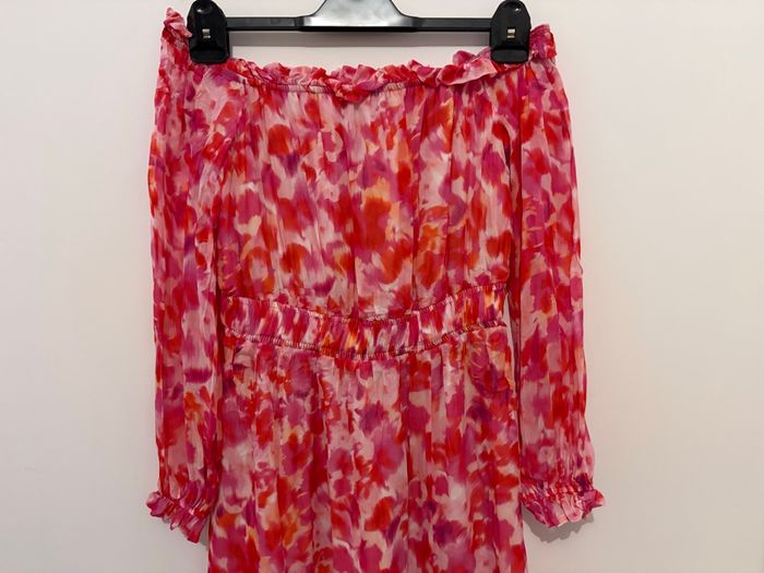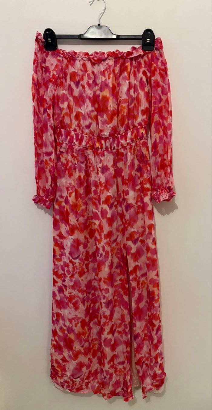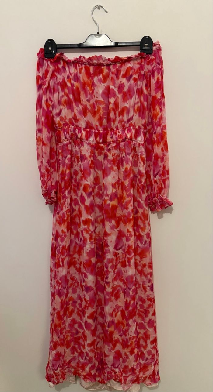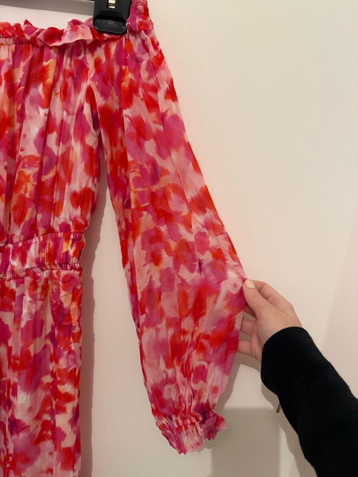 Il s’agit d’une robe longue à imprimé floral abstrait dans des tons vibrants de rose, fuchsia, rouge et quelques touches de blanc. Le tissu est léger, fluide et légèrement transparent, avec une doublure intérieure rose pâle pour plus d’opacité. La robe possède : • Un décolleté élastiqué avec un effet légèrement froncé, permettant un porter épaules dénudées ou classique. • Des manches longues resserrées aux poignets par un élastique, créant un effet volanté. • Une taille élastiquée, marquant subtilement la silhouette. • Une fente sur le bas du vêtement, à l’avant ou légèrement sur le côté, qui apporte de la fluidité et un style plus aérien. • Une coupe globalement ample et fluide, très féminine et confortable. La robe est signée Kookai, en taille 38, fabriquée