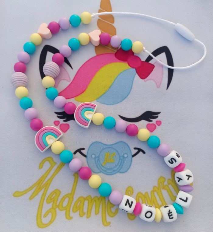 Un joli collier Arc-en-ciel 2en1, facilite la prise au sein pour l'allaitement en apaisant bébé au touché du collier, la prise du biberon également. Occupe bébé quand il est dans vos bras et évite qu'il s'amuse avec vos bijoux. Sert également pour la dentition. Respect des normes CE, composée de perles silicone alimentaire et/ou bois naturel. 100% personnalisable, énormément de choix de clips, perles, etc… Envoyez-moi un message afin de créer main dans la main votre accessoire idéal. Une photo du prototype de celui-ci vous est envoyé pour validation avant envoi.