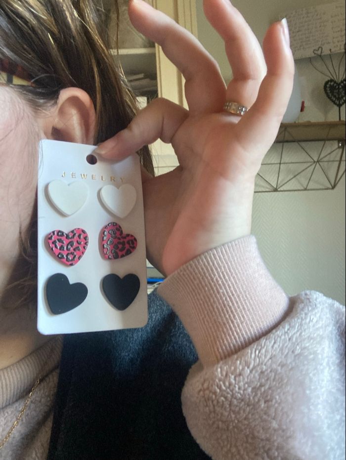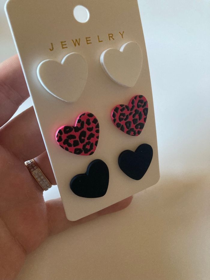 DRESSING PROPOSANT RÉDUCTIONS 💶😀 ❤️IDÉALES POUR LA SAINT-VALENTIN.❤️ Boucles d’oreilles pour femme en forme de cœurs. Pour oreilles percées. Marque : Jewelry Couleurs : Blanc, rose et noir TRÈS LÉGÈRES ✨NEUVES avec étiquette. Jamais portées.✨ Prix : 3€80 Je dépose DANS LA MESURE DU POSSIBLE les colis 📦 le lendemain du paiement. 😉 MAIS SI CEST UN ENVOI URGENT, MERCI DE ME LE PRÉCISER ☺️. N’hésitez pas à jeter un coup d’👀 à mes évaluations. 🙂