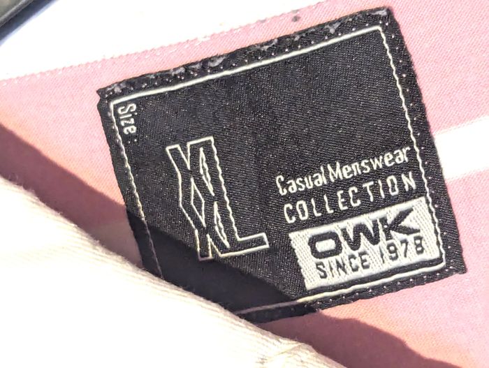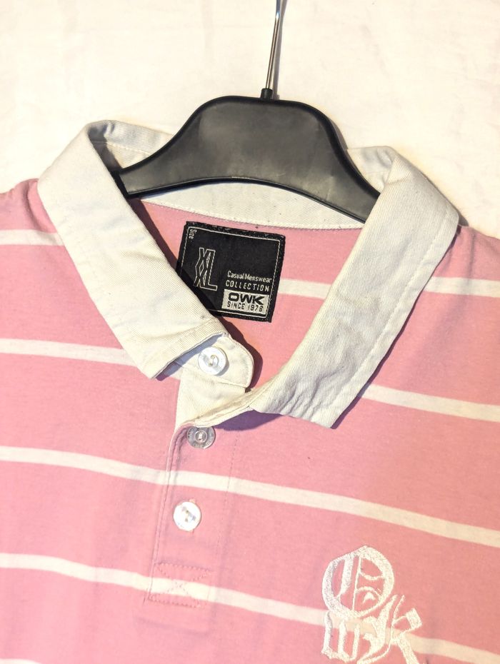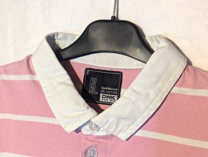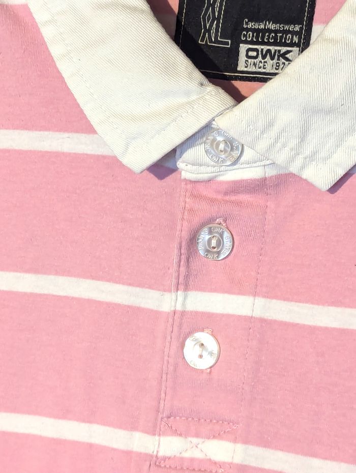 Polo "OWK" Rose avec des Rayures Horizontales Blanches et le Nombre 25 sur une des Manches. Vêtement Tendance à la Mode pour les Hommes. ☑ Polo "OWK". ☑ Rayures "Horizontales". ☑ Nombre "25". ☑ Tendance - Mode. Spécifications: Matière: 100% Coton Taille du Polo: XXL Couleur Dominante: Rose Couleur des Rayures: Blanc Réf: vea15