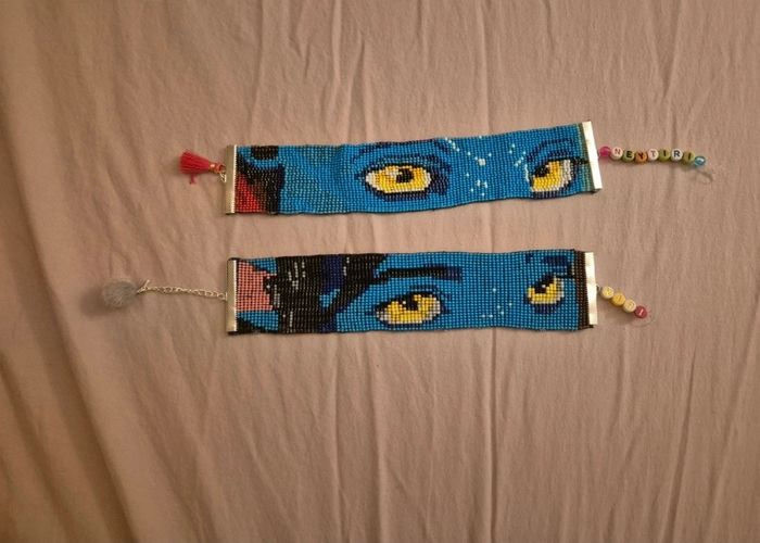 Vends ces jolis marque-page avatar en perles miyuki 2mm représentant les personnages Neytiri et Kiri du film Avatar. ​Accessoires : Fermoirs argentés, chaînette de rallonge, pompon de décoration, et perles lettres pour inscrire les prenoms kiri et Neytiri Tbe Derniers restants ! Egalement un marque page de Varang cette fois ci que les yeux