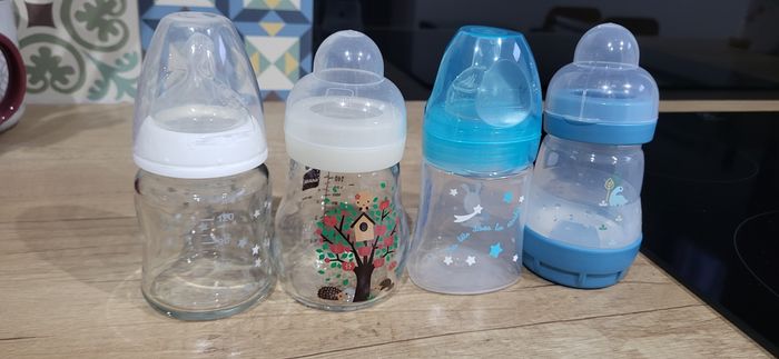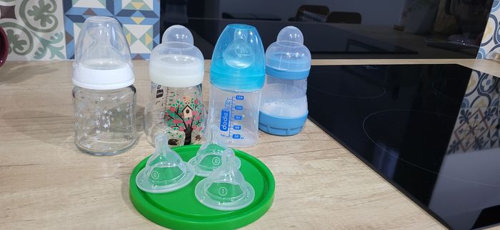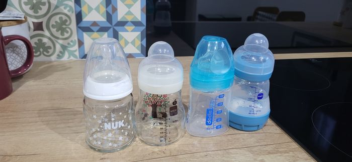 Lot de biberons: -2 en verre (Nuk et Mam) -Un plastique (Doddie) - Un anti collique (Mam) J ai utilisé un peu le Mam en verre et une fois le anti collique Les autres jamais -3 tétines mam neuves taille 0 et 1
