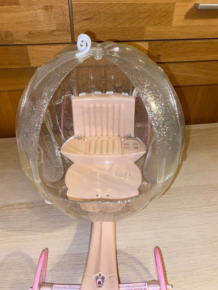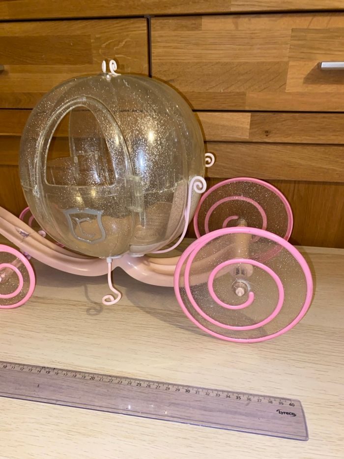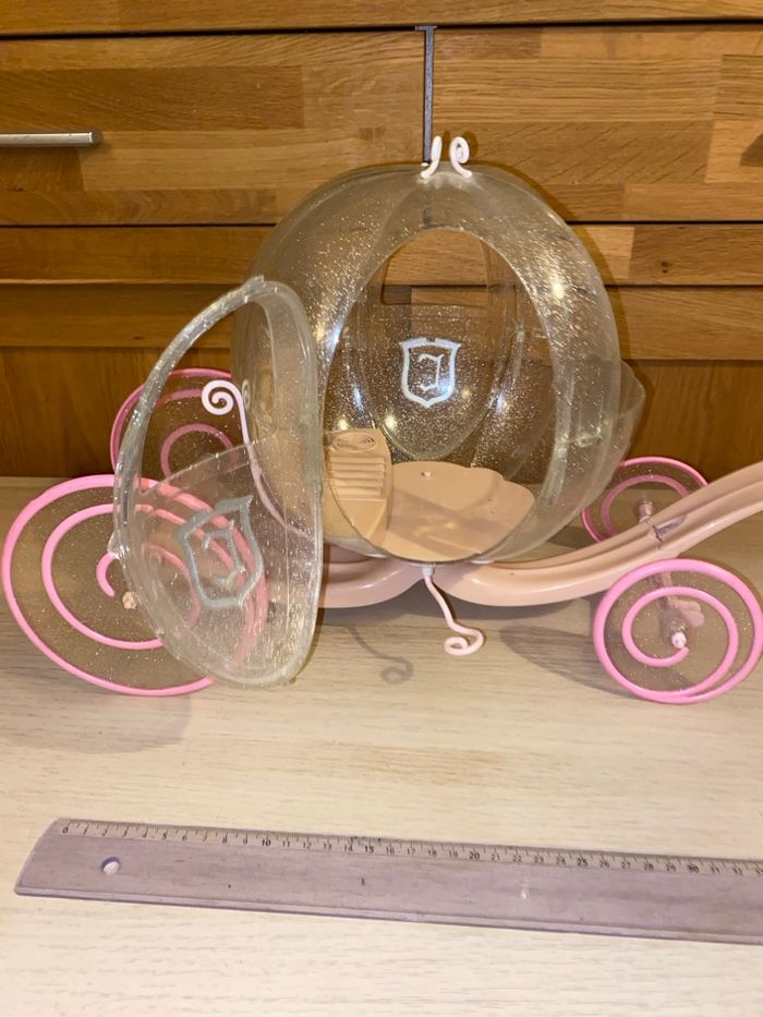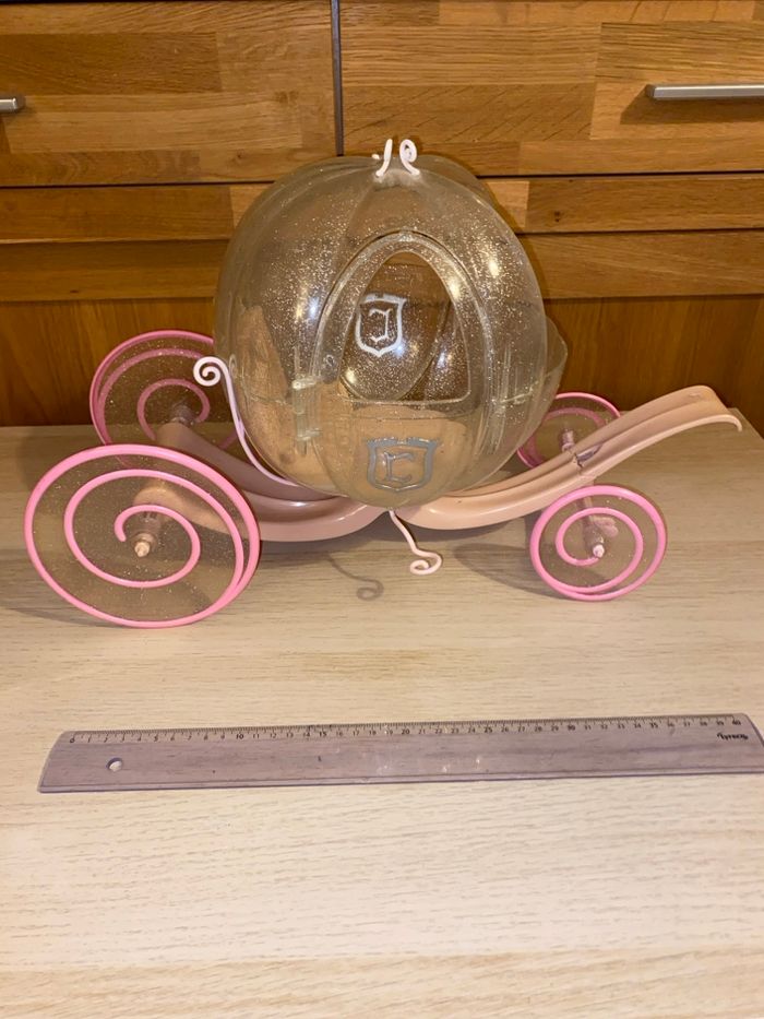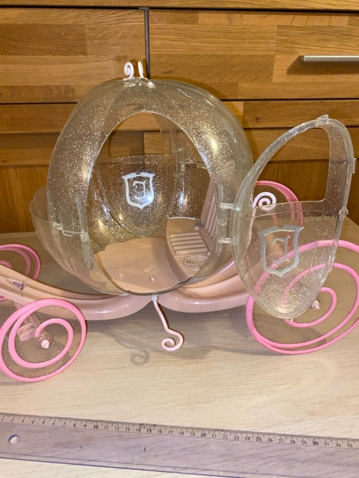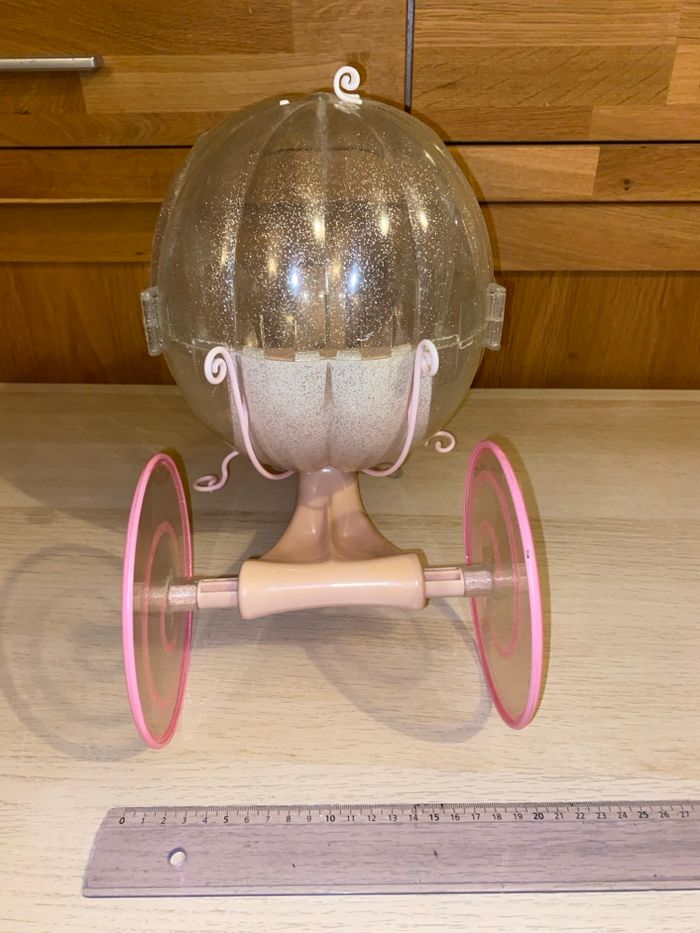 Carrosse pour poupée taille Barbie. La lumière et le son ne fonctionnent plus, les piles ont coulé. Vendu sans cheval.