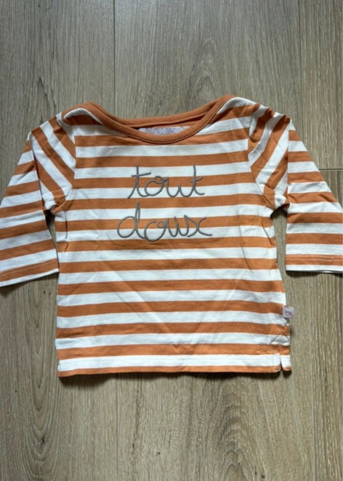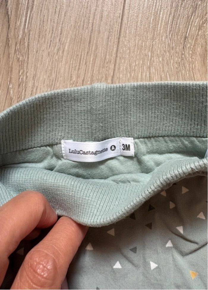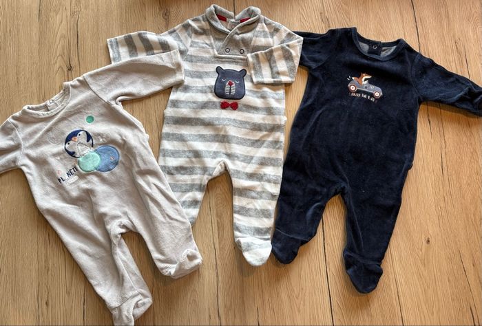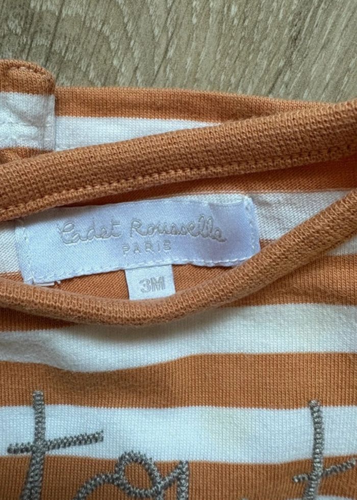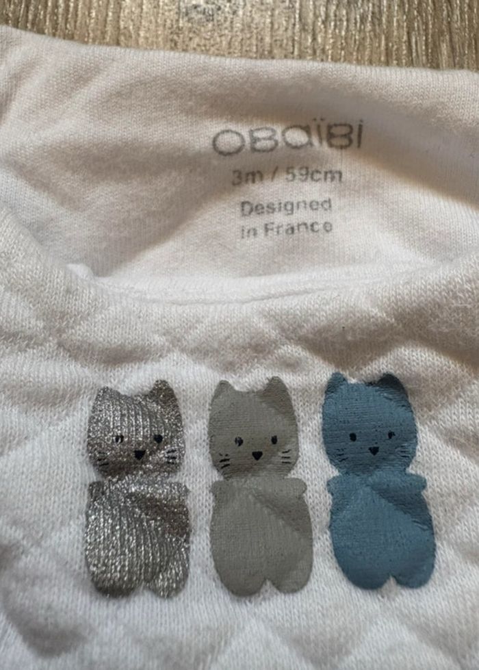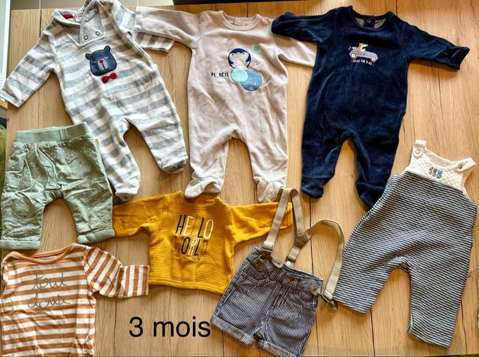 Lot de vêtements bébé taille 3 mois comprend : - 1 haut manche longue Tape à l’œil - 1 haut manche longue Cadet Rousselle 100% coton - 1 pantalon Lulu castagnette 100% coton - 1 short à bretelles Orchestra (abîmé sur le devant au niveau de la poche droite) - 1 combinaison longue Obaibi 80% coton 20% polyester - 1 grenouillère Obaibi qours rayé gris blanc 80% coton 20% polyester - 1 grenouillère bleu marine Renard Vertbaudet 75% coton 25% polyester - 1 grenouillère grise pingouin Sucre d’orge 75% coton 25% polyester