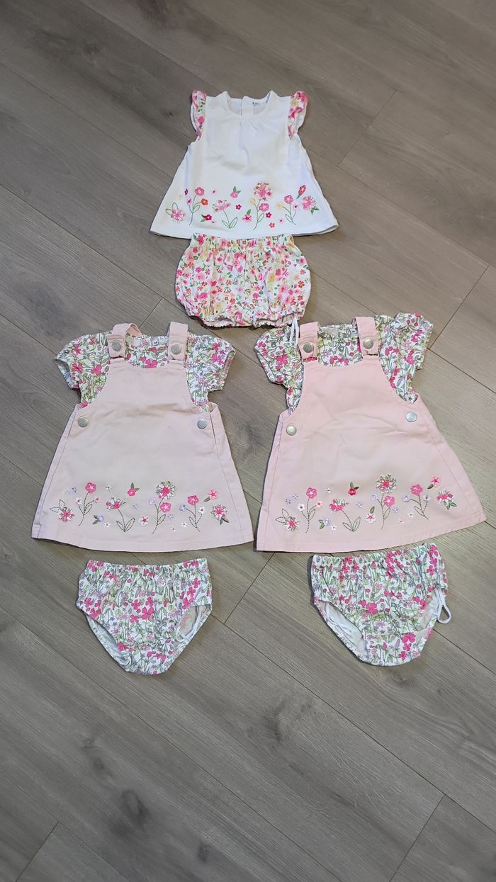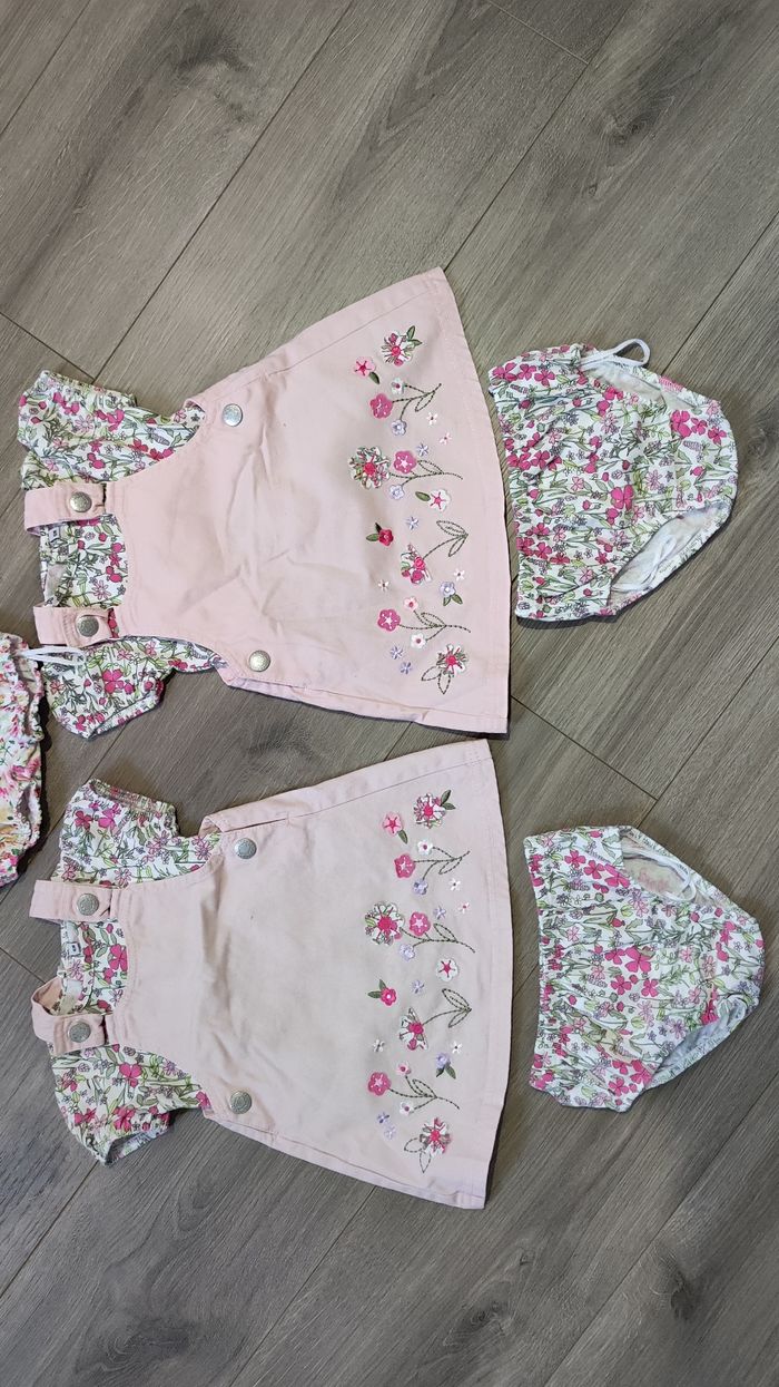 Tenue 6 mois (idéal pour Jumelles), pour mon cas je les ai eu en double 😅 Je mets avec une autre petite tenue qui ressemble aux deux autres Taille 6 mois En très bon état