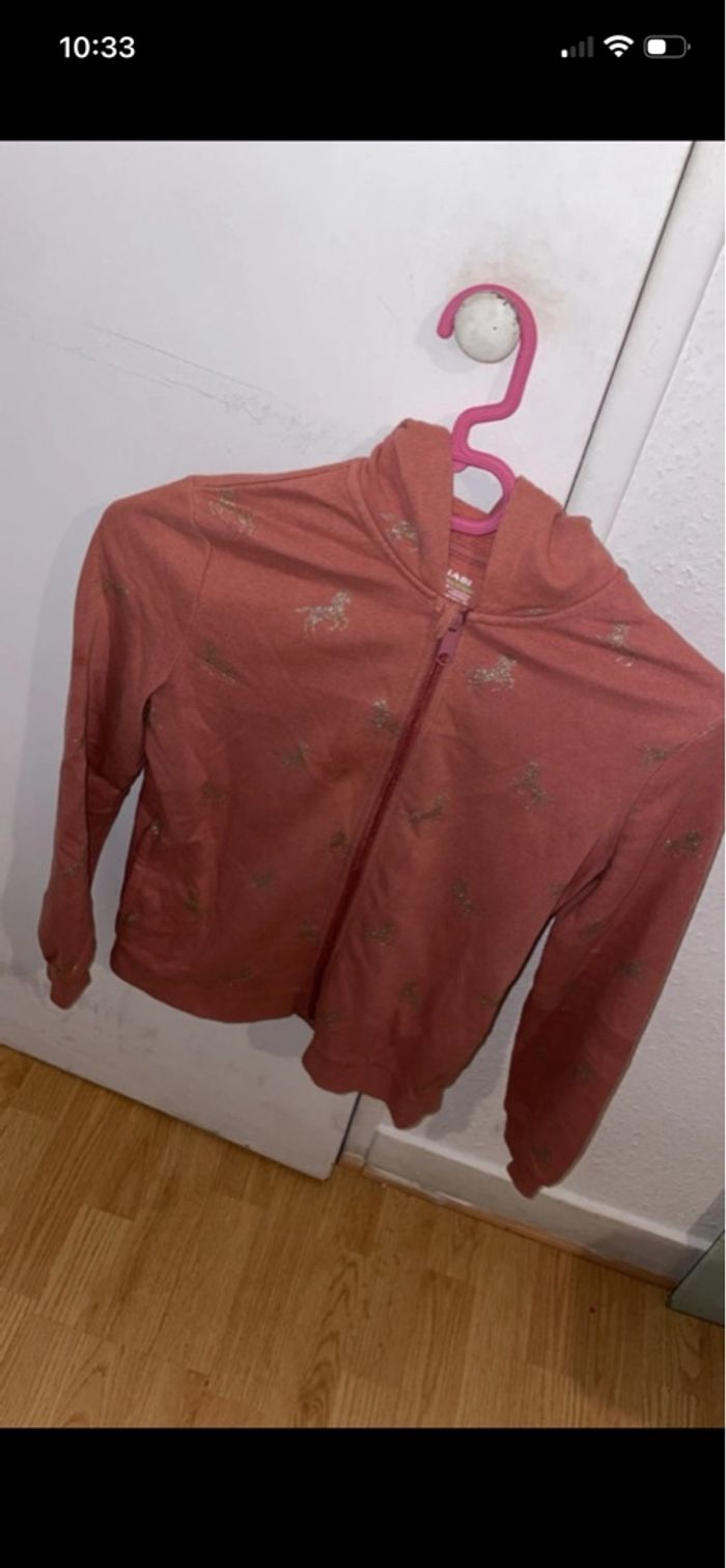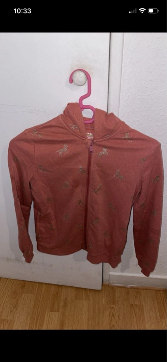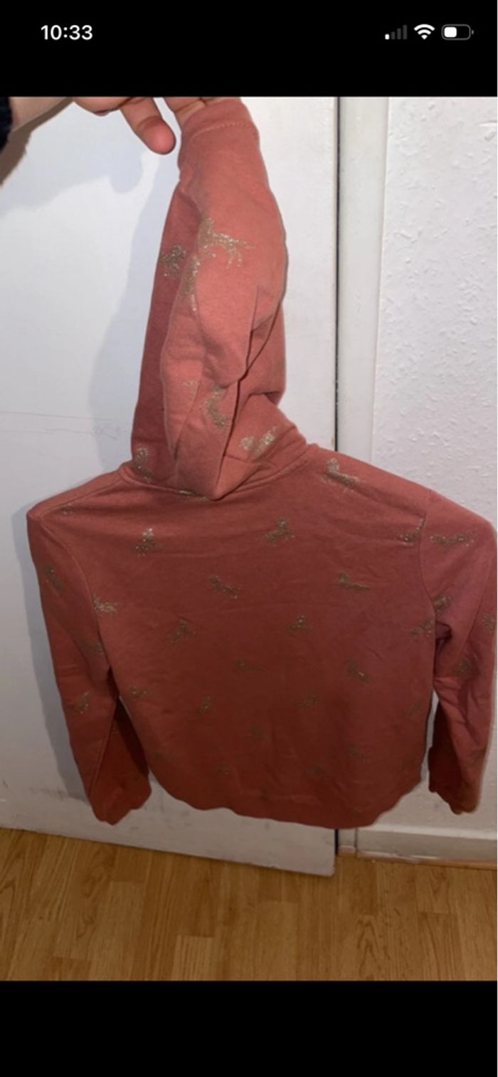 Veste fille, motif licorne couleur or, taille 12 ans, en bon état, couleur corail, marque KIABI, 77% coton & 23% polyester, lavable en machine à 30• degrés, repassage OK à l’enver