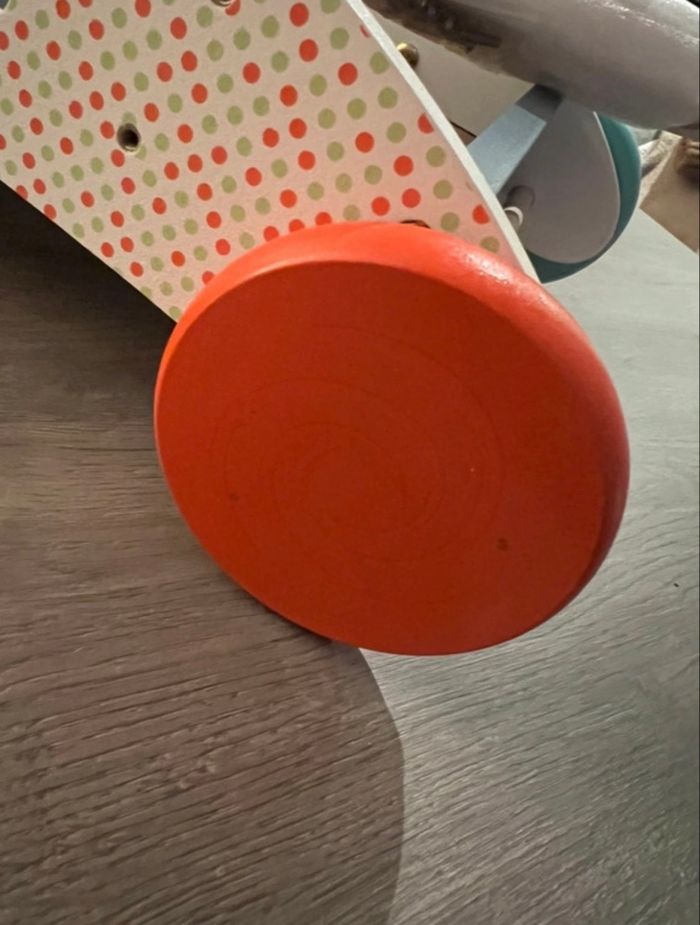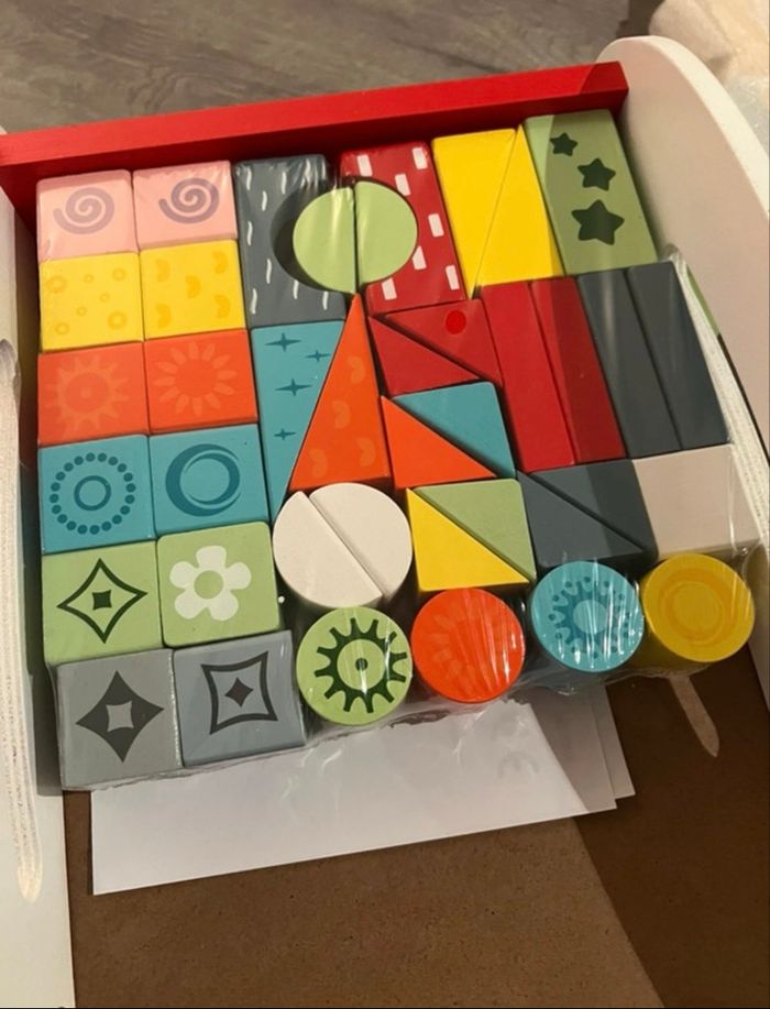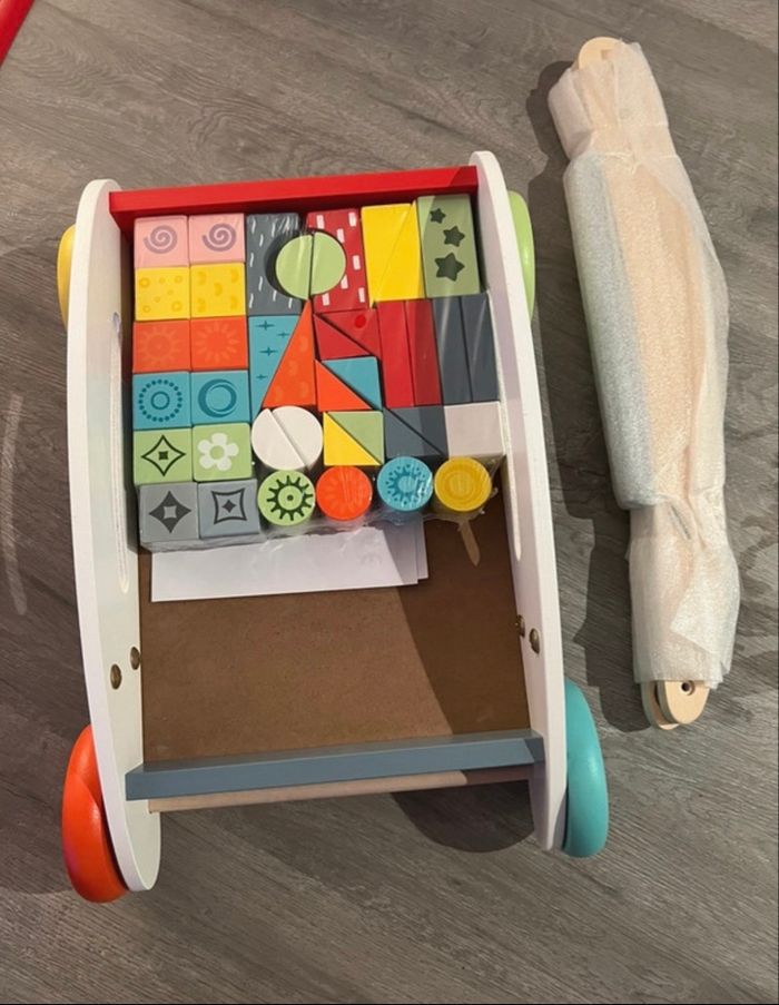 Chariot de marche en bois avec blocs Les blocs en bois sont dans l’emballage d’origine (non ouvert) Légère trace sur la roue rouge. Chariot non utilisé.