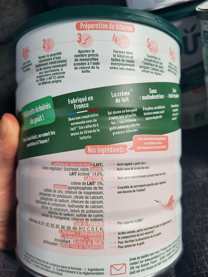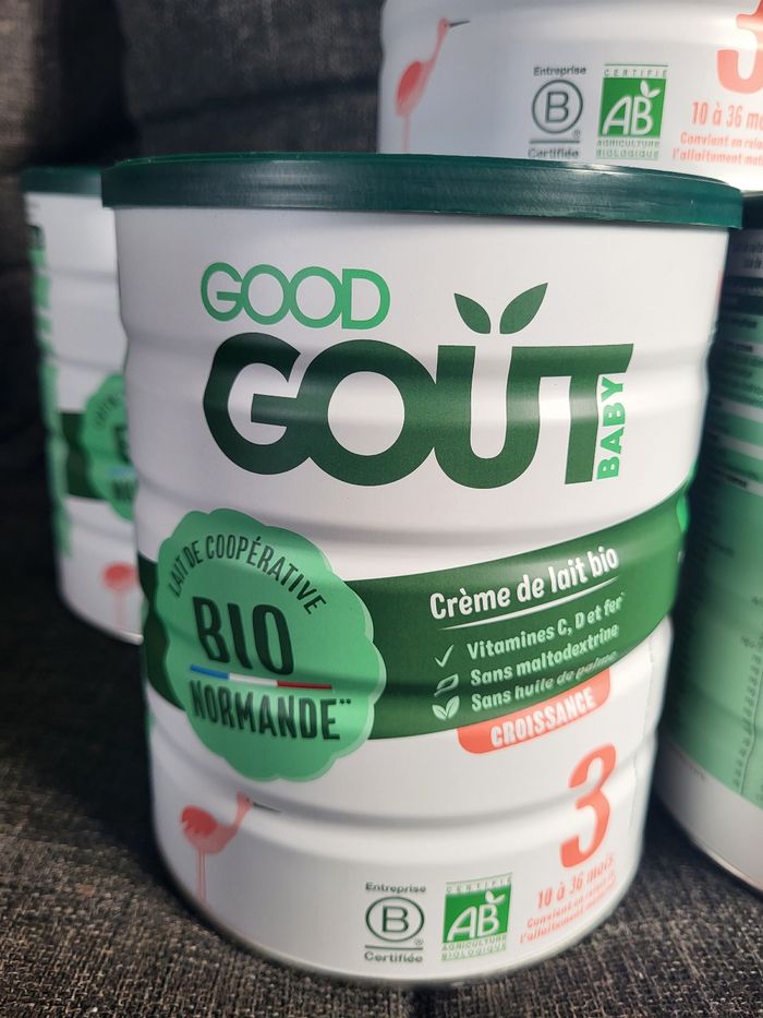 Lot de 5 boîtes neuves good goût croissance Biologique DLC 22/07/2026 + 1 ouverte (offerte) le 17/01/2026 3 biberons de 300ml ont été fait Ma fille ne l'a pas acceptée
