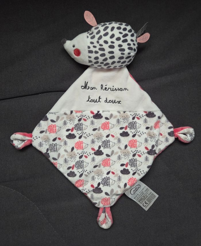 Doudou Hérisson en velours de couleur blanc et gris. Étiquettes feuilles cousus dessus . Losange en velours de couleur blanc avec motifs dessus : Hérissons , nuages , sapins , feuilles ....et écriture brodé sur le haut " Mon Hérisson tout doux " et de l'autre côté en velours de couleur rose.