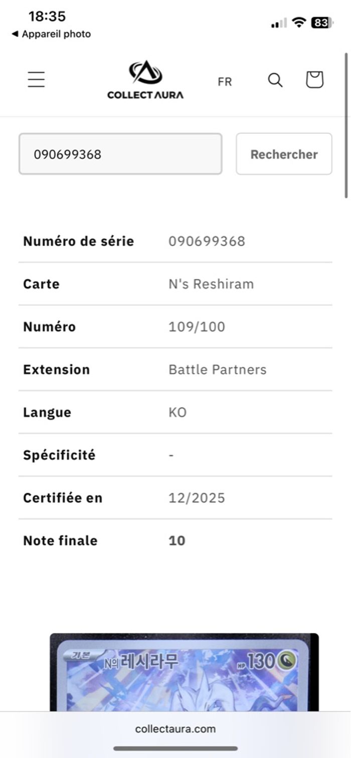 Pokemon carte gradé Reshiram de N AR (sv9 109) Battle Partners 003/063 ev09 aventure ensemble en Fr Collect aura 10 !!! Seulement 2 exemplaires au monde en CA10 Equivalent cc / psa / sfg / pca / beckett Échange possible contre evolution prismatique 8.5 Ev9 aventure ensemble Ev10 team rocket Mega evolution ME01 Me02