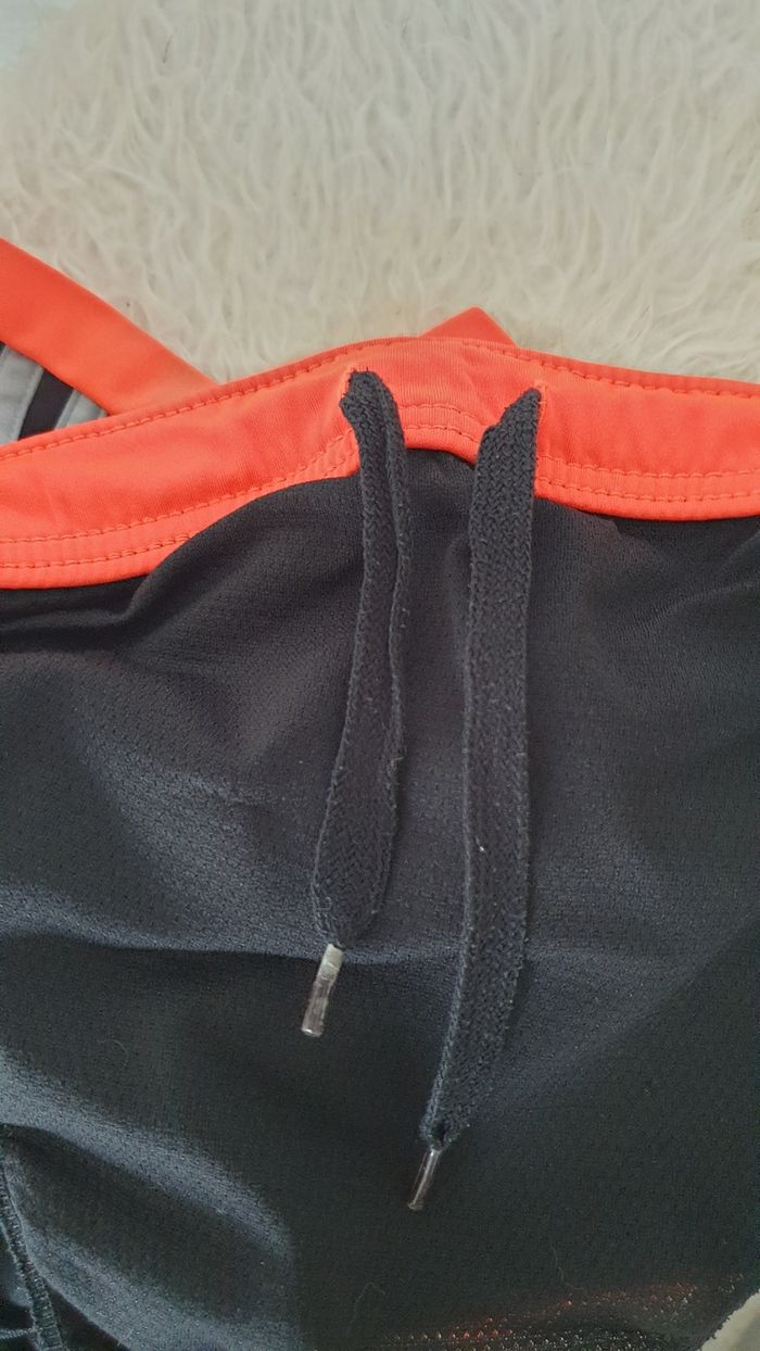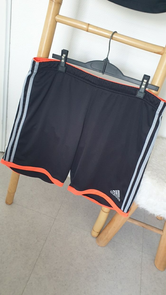 Ensemble homme Adidas Plus d etiquette de taille parce que ça gratte mais correspond à du M Matière respirante Porté mais reste en bon état général. Pas de trou ni de déchirure. L élastique du short montre des signes de faiblesse mais le lacet de serrage est ok.