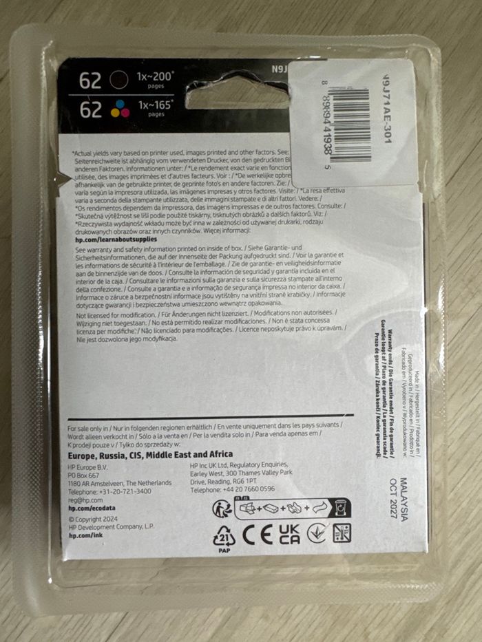 Cartouche d’encre hp 62 neuves Noir et couleurs Date de fin de garantie : 10/2027