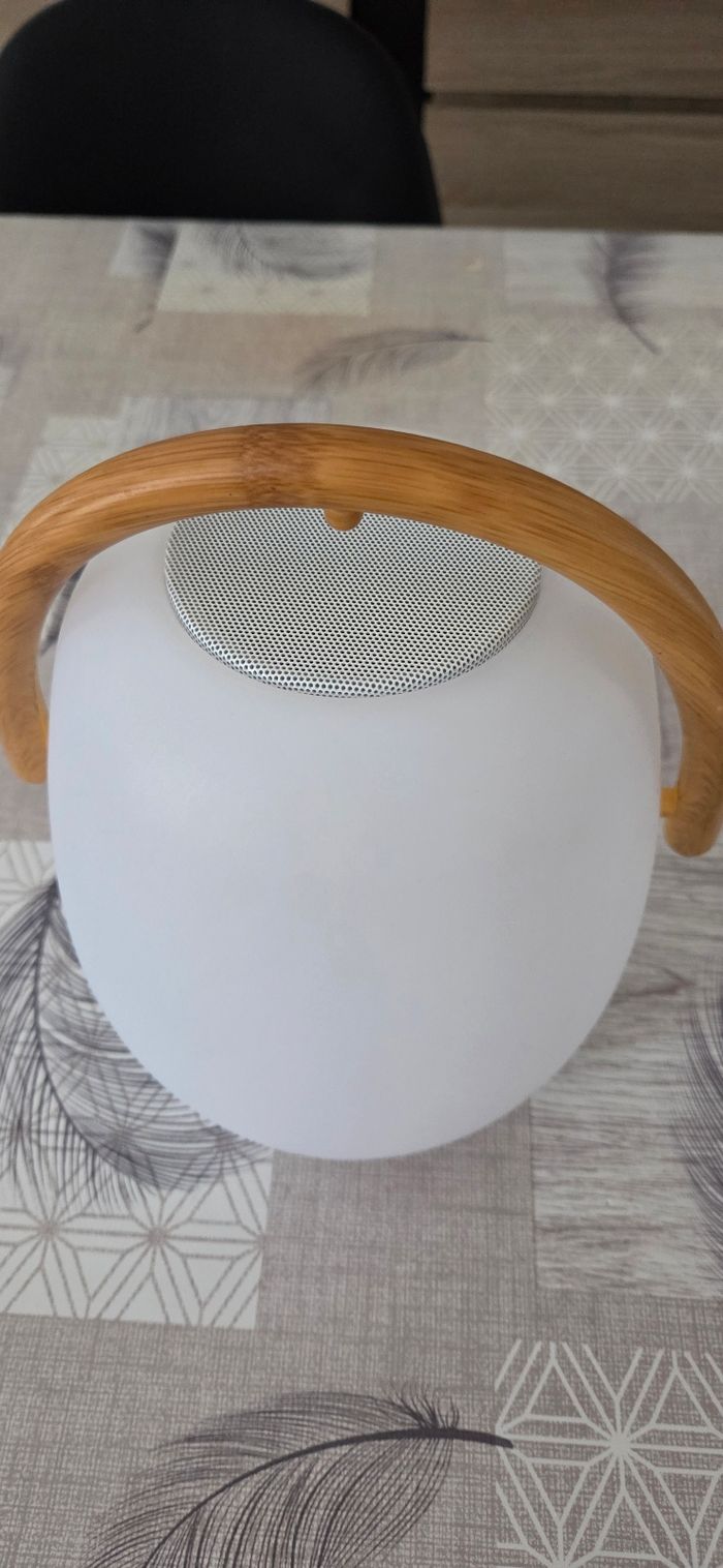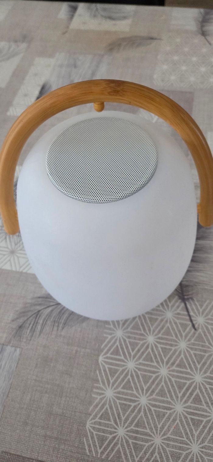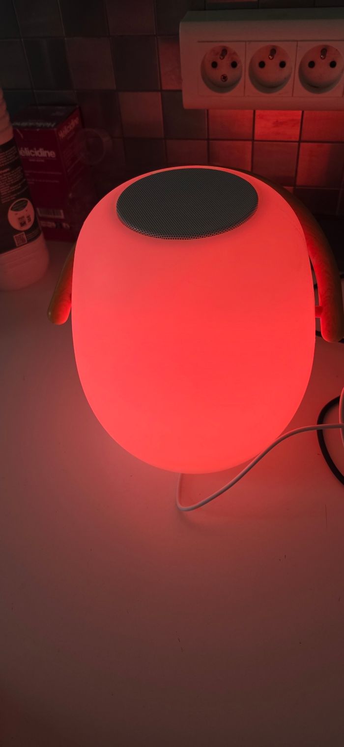 Lampe multicolore qui fait aussi enceinte connectée Bluetooth Elle peut aller à l'extérieur comme intérieur en lampe d'ambiance. La lumière fonctionne au rythme de la musique. Fourni avec son fil pour la recharger Hauteur 20 cm Jamais utilisé