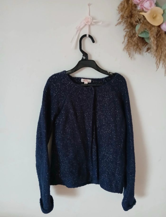 Joli gilet bleu marine à paillettes, idéal pour une tenue chic ou festive ✨ Coupe confortable, manches longues. Les paillettes sont discrètes et bien intégrées au tissu. 🔹 Taille : 8 ans / 128 cm 🔹 Couleur : bleu marine 🔹 État : très bon état, pas de taches ni de trous
