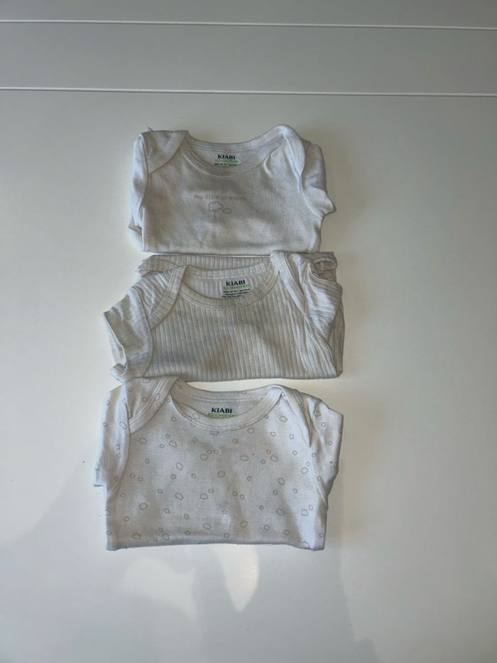 Lot de 3 bodies manches courtes 3 mois Kiabi Taché par le temps mais bon état. En frottant ca part