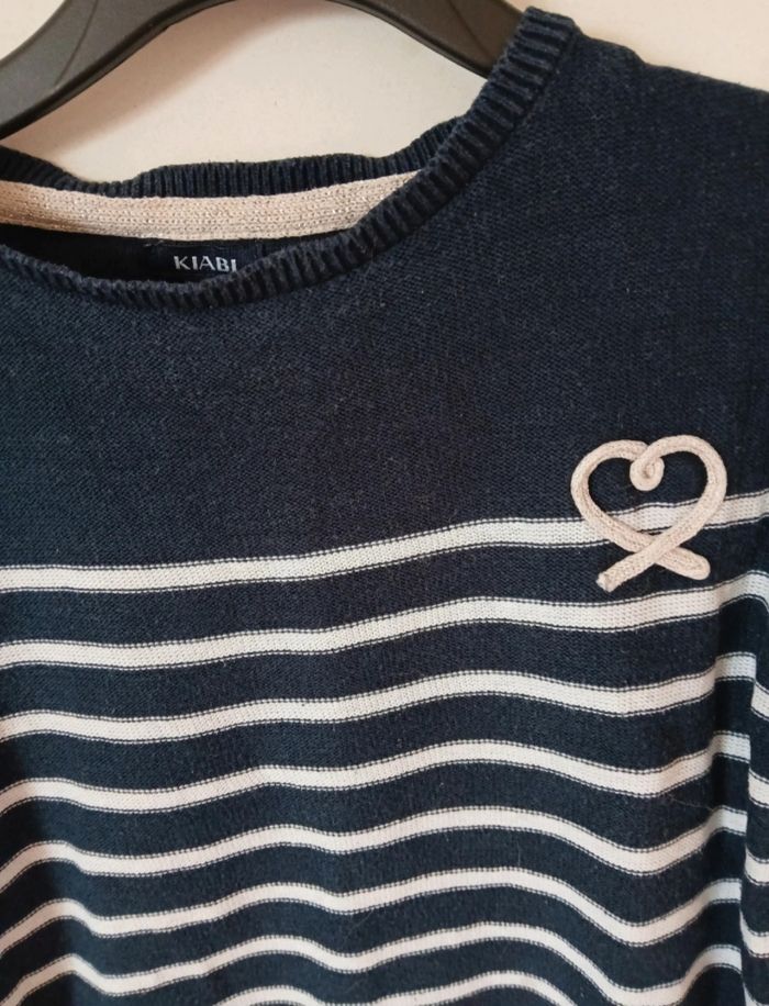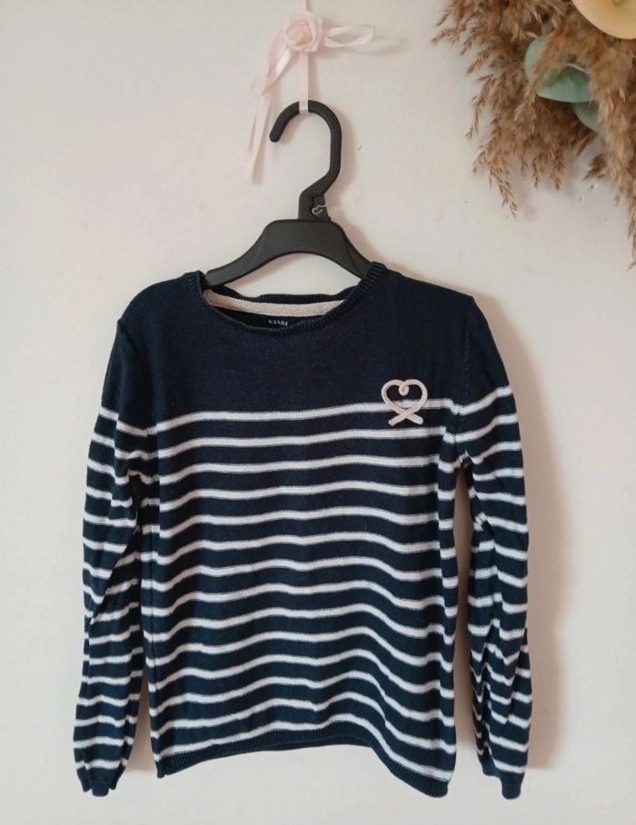 Pull bleu marine à rayures blanches de la marque Kiabi. Matière douce et agréable à porter, idéal pour la mi-saison ou l’hiver. Petit détail cœur brodé sur la poitrine qui apporte une touche mignonne ❤️ 🔹 Taille : 8 ans / 128 cm 🔹 Couleur : bleu marine et blanc 🔹 Motif : rayures 🔹 Marque : Kiabi 🔹 État : bon état Parfait pour l’école ou le quotidien. Maison non-fumeur, envoi soigné 📦