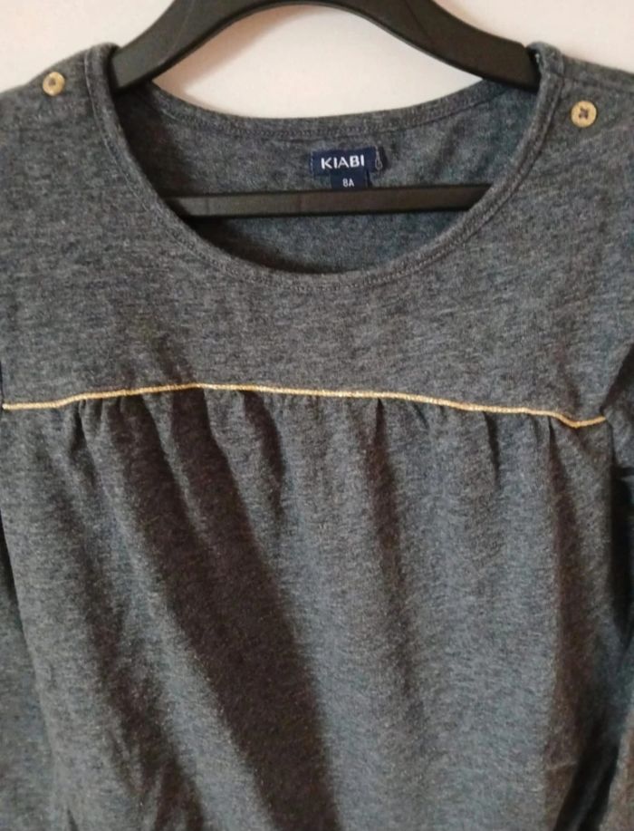 Jolie blouse manches longues gris foncé avec détails dorés (petits boutons aux épaules et liseré doré sur le devant). Coupe confortable et tissu agréable à porter. 👉 Très bon état : pas de tache, pas de trou. Parfaite pour l’école comme pour une tenue un peu plus habillée 🌟 📏 Taille : 8 ans / 128 cm