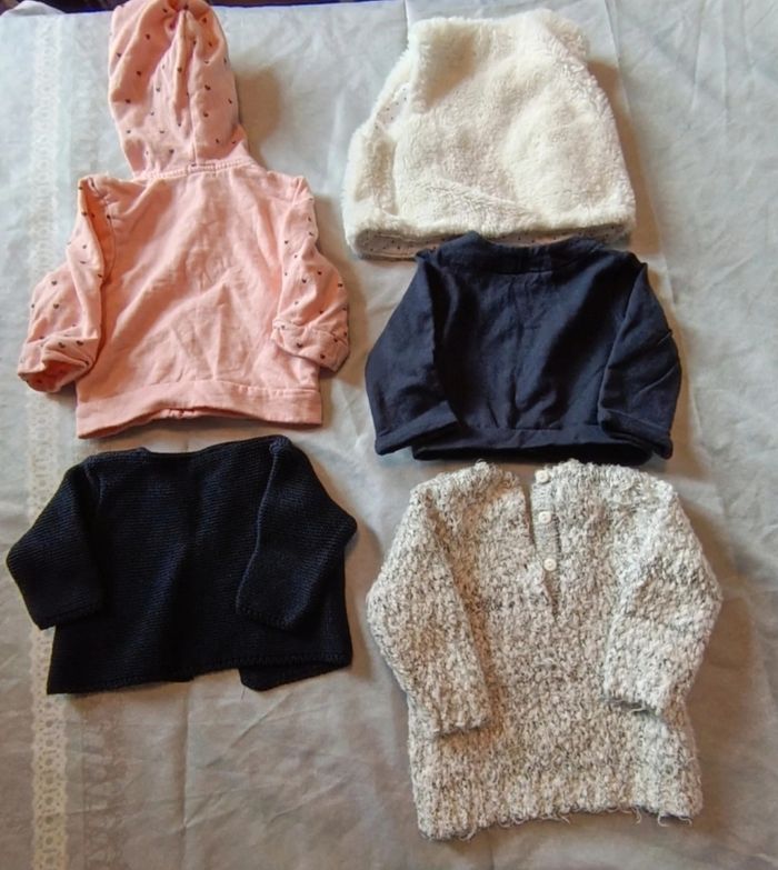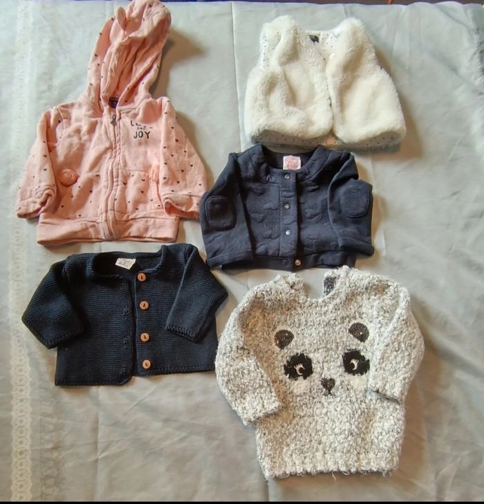 💮 Lot 💮 3 gilets manches longues 💮 1 gilet sans manches 💮 1 pull 💮 6 mois 💮 Très bon état 💮 Différente marque (Gémo, to be chicco, kiabi, boîte à malice) 💮 Possibilité de séparer le lot