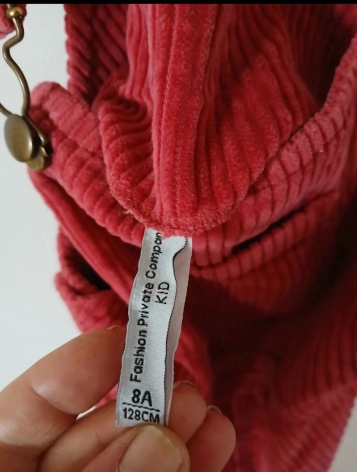 Robe salopette pour fille en velours côtelé, couleur rouge/bordeaux, marque Fashion Private Company, taille 8 ans (128 cm). Bretelles réglables, poches pratiques, matière douce et confortable. Bon état, quelques traces normales d’usage mais reste très jolie portée. Idéale pour l’automne / hiver avec un pull ou un t-shirt dessous 🍂 Maison non-fumeur. Envoi rapide 📦