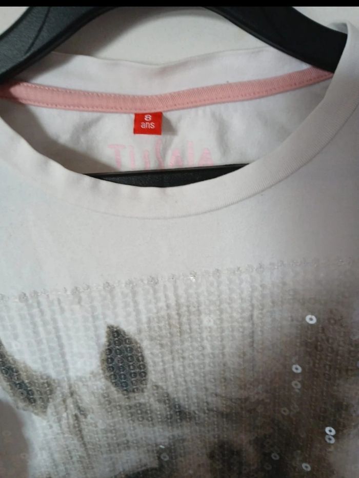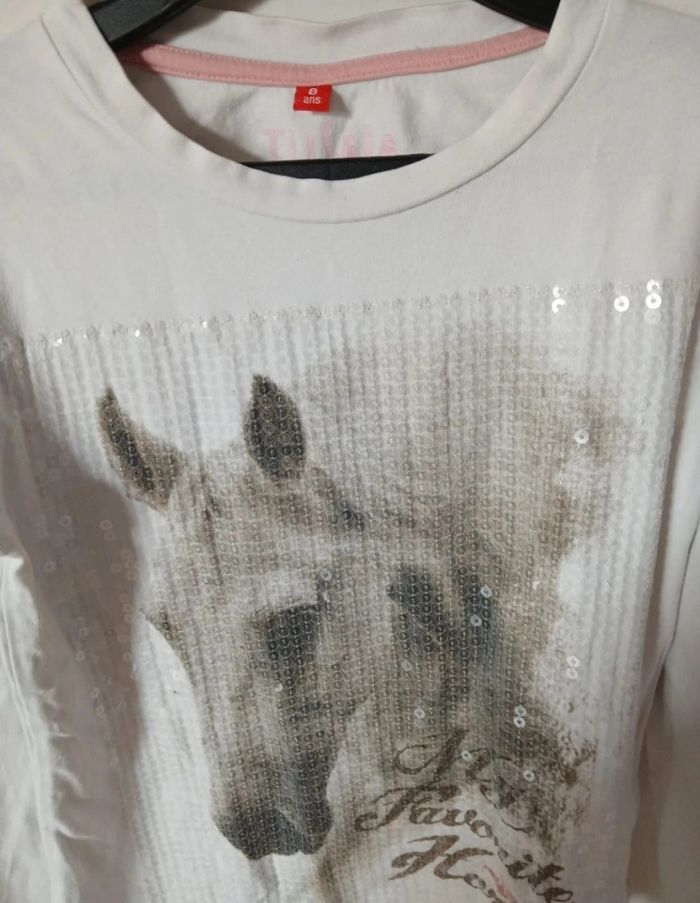 T-shirt manches longues pour enfant, marque Tissaia, taille 8 ans / 128 cm. Couleur blanche avec motif cheval à l’avant et détails brillants (sequins) ✨ Matière agréable à porter, parfait pour la mi-saison ou sous un pull. 🔹 Taille : 8 ans (128 cm) 🔹 Marque : Tissaia 🔹 Couleur : blanc 🔹 Motif : cheval 🔹 État : bon état Envoi rapide et soigné 📦
