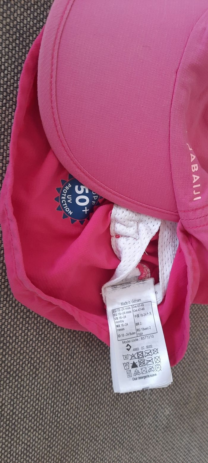 Casquette anti-UV, taille 18-24 mois. Ma fille l'a même portée jusqu'à ses 3 ans. En bon état (couleur devenue terne mais très bon état du tissu)