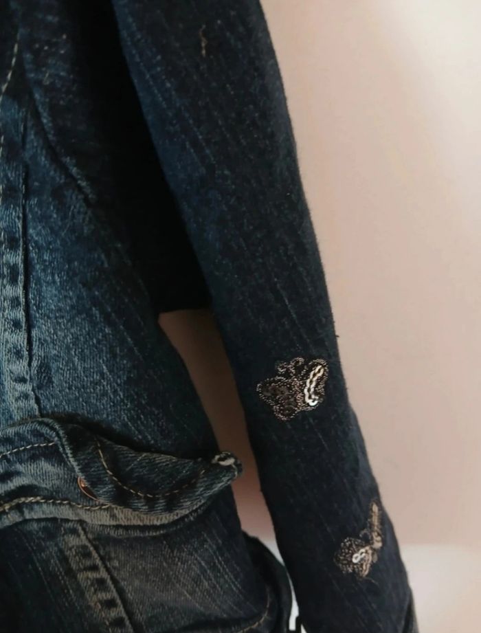Jolie veste en jean Peperoncino, coupe courte et travaillée, avec de jolis détails brodés 🦋 Idéale pour la mi-saison. 🔹 Taille : 8 ans / 128 cm 🔹 Marque : Peperoncino 🔹 État : Très bon état 🔹 Couleur : Jean bleu 🔹 Fermeture : Boutons 🔹 Style : Chic et décontracté Portée avec soin, maison non-fumeur. 📦 Envoi rapide et soigné