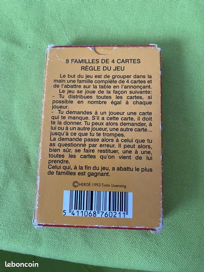 Je vends ce jeu de cartes Tintin, un jeu de sept familles pour les enfants de 4 à 6 ans. - Type de produit : Jeux éducatifs - jeux des sept familles - Âge recommandé : De 4 à 6 ans - Composition du lot : 8 familles de 4 cartes Très bon état. N'hésitez pas à me contacter pour plus d'informations sur ce jeu de cartes Tintin !