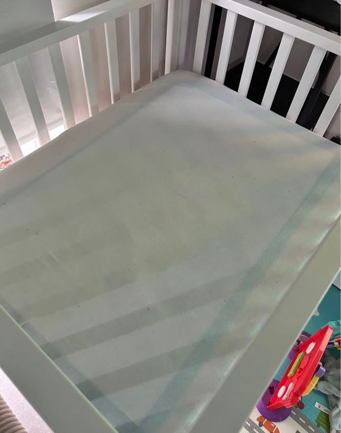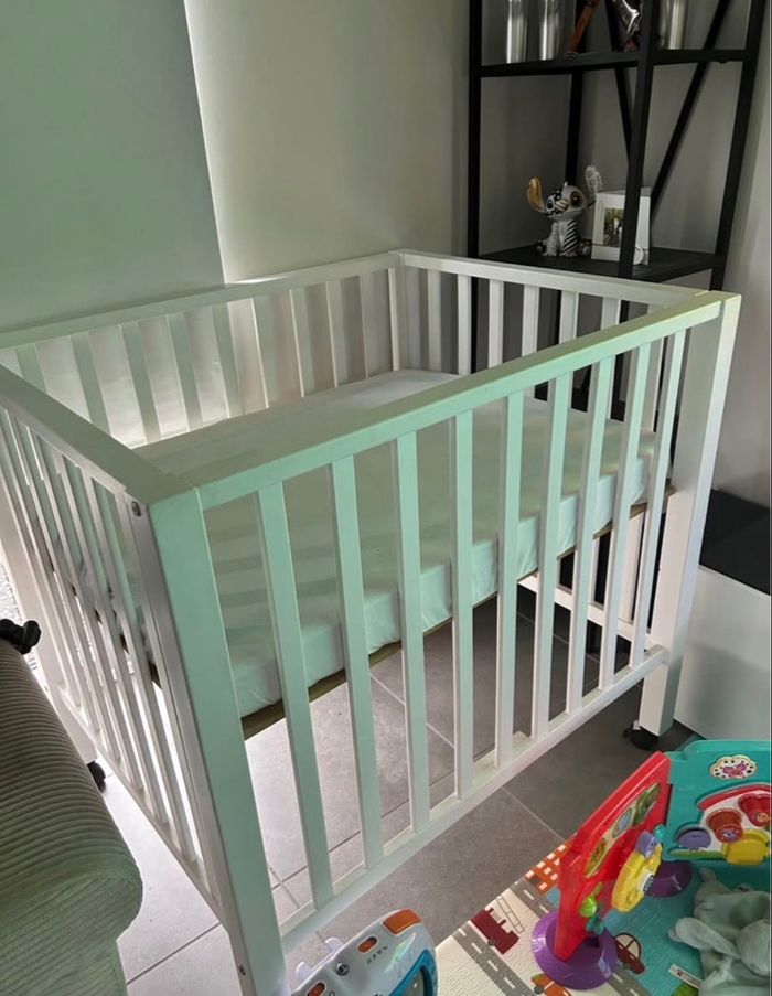 Parc Pericles blanc à roulettes Il n’a servi que 3 mois Dimensions 75x95cm Vendu avec le matelas ainsi que 2 housses de matelas Deux traces de peintures sur les roues (défaut d’usine) Plus d’infos en mp