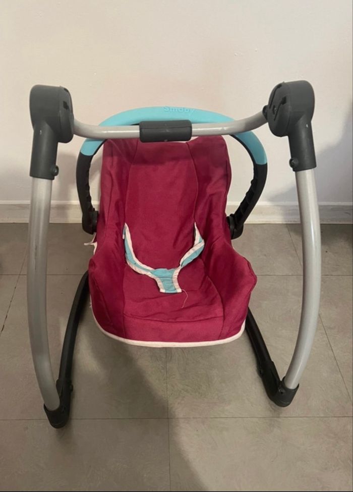 Chaise haute/ balancelle et cosy Votre enfant peut mettre le poupon dans la chaise haute comme s'il allait manger, dans la balancelle pour le bercer et le cosy pour l'emmener partout avec soit pour faire comme maman et papa
