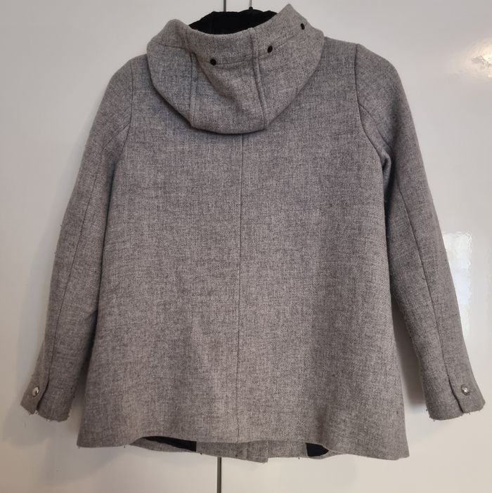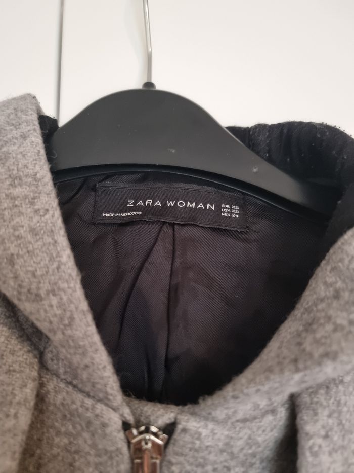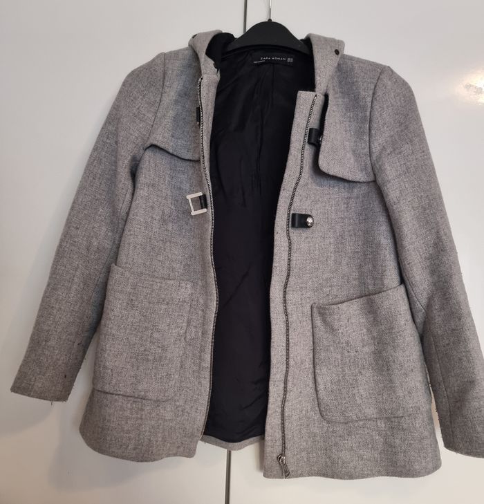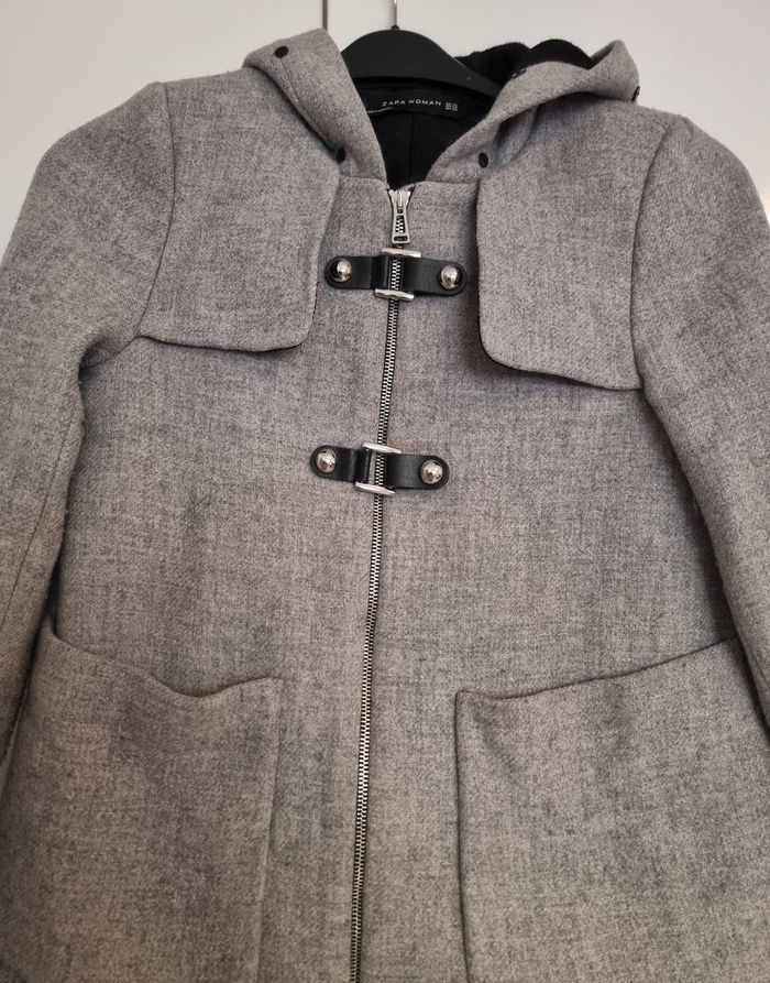 Manteau Zara Woman gris en très bon état. Coupe droite avec capuche, fermeture zippée et jolis détails en similicuir au niveau des boutons. Convient aussi au taille S À noter : la fourrure d'origine de la capuche n'est plus présente.