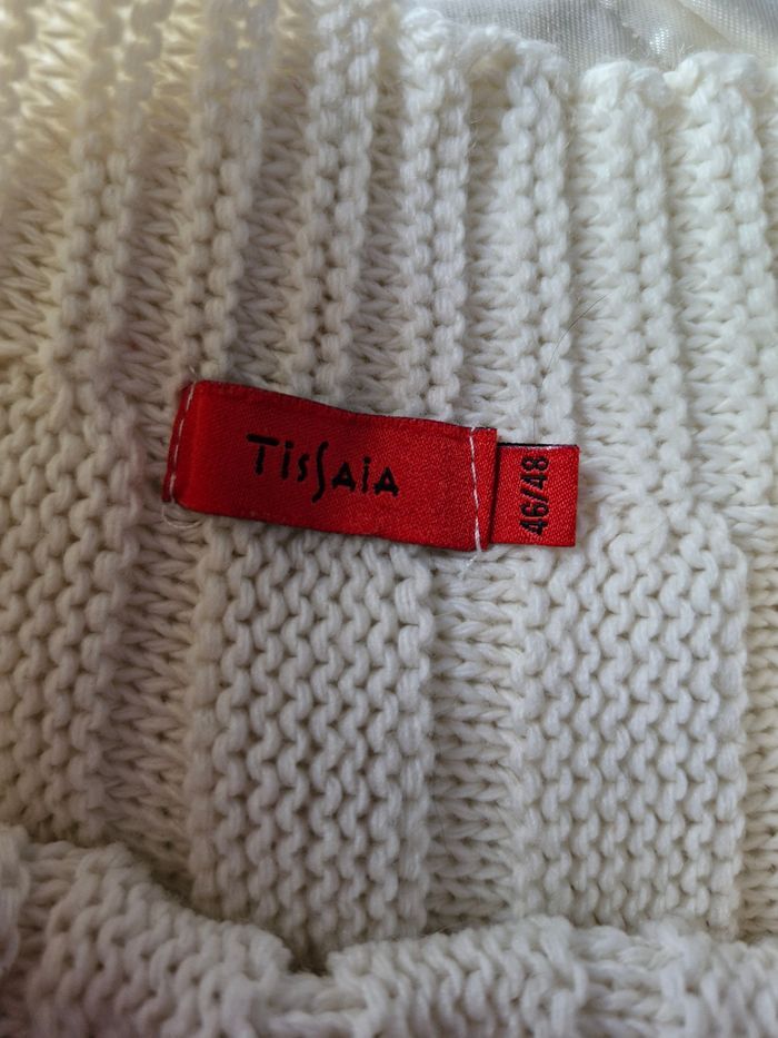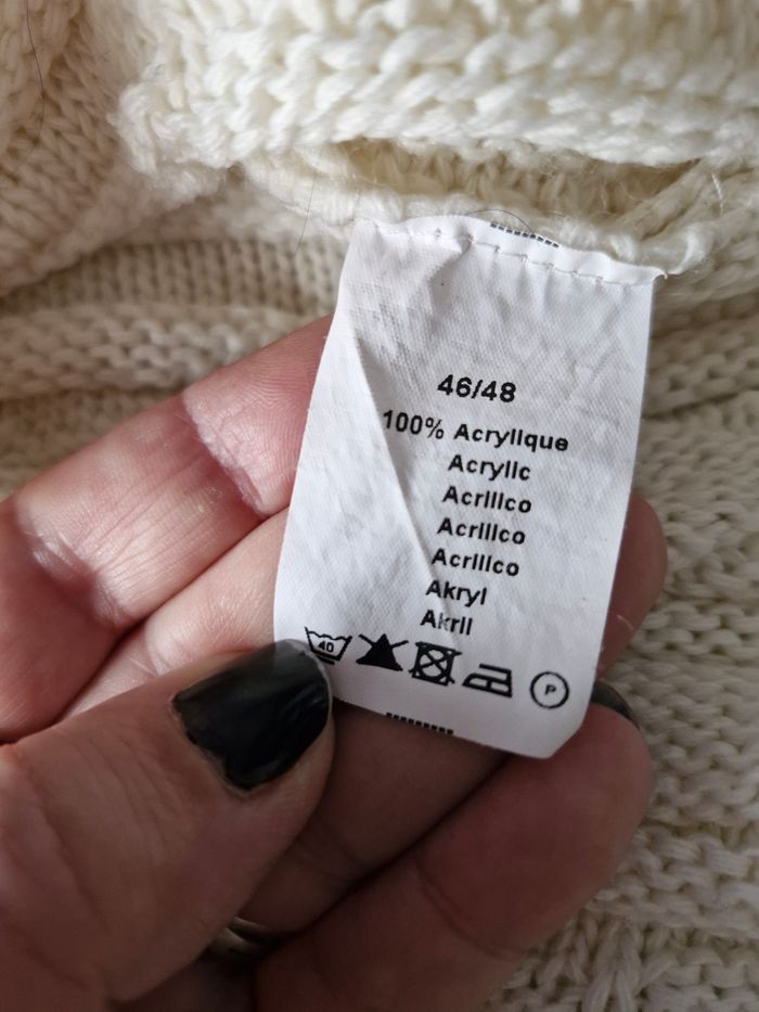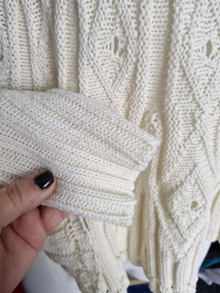 🌸Superbe poncho en maille tricot. ⚕️Avec passage de bras (manches) 💮 Plusieurs mailles ajourées pour un bel effet décoratif ⚪️Couleur écru, crème (dispo aussi en noir sur mon dressing) 🌟 Marque Tissaia 🏷 Taille 46/48 (ira aussi pour un 48/50 cf dernière photo) 📌Mesures sur tissu extensible Poitrine 100cms à plat Hauteur 60cms 📷Bien regarder les photos pour le détail 🚨Défauts à signaler Je n'ai pas remarqué d'anomalie 💲Faites des économies en créant un lot pour profiter des réductions actives dès 2 articles #naya59199veste #naya59199vestefemme #naya59199femme48 #naya59199femme46
