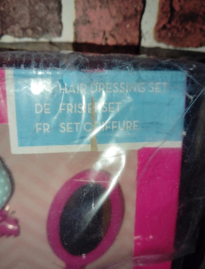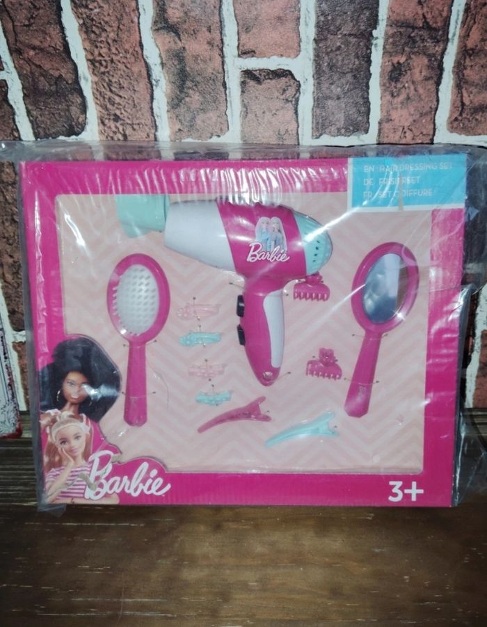 Set coiffure barbie avec sèche cheveux qui fonctionne à piles, boîte neuve mais abîmée.