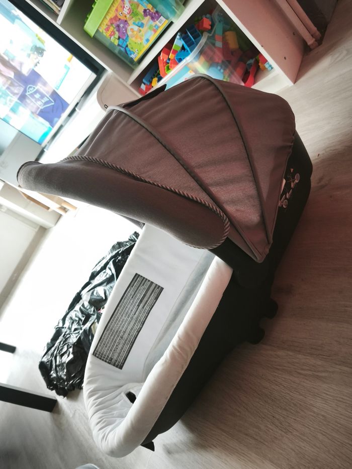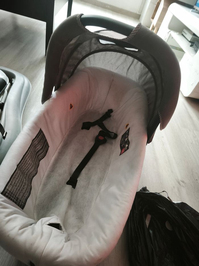 Nacelle blanche et grise, il manque le matelas. Tache sur la partie blanche que j'ai du mal à faire partie bébé confort Non homologué pour la voiture mais pratique pour la maison