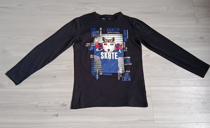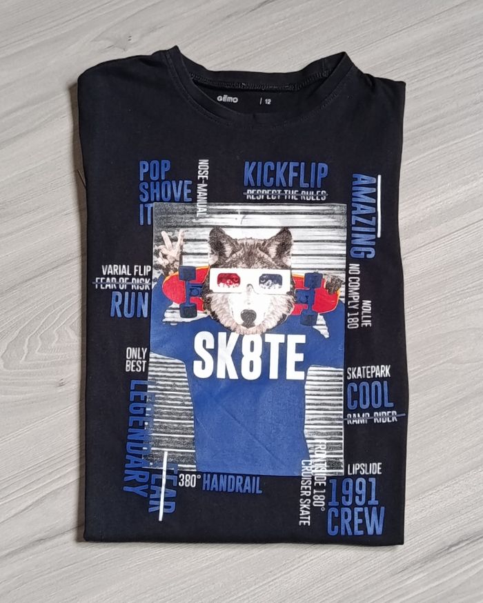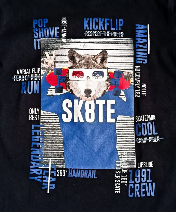 Très beau tee-shirt à manches longues de couleur noire, imprimé. Encolure ronde. Dessin humoristique d'un chien avec son skate sur le devant et avec de multiples inscriptions. Marque KIABI. Taille 12 ans (152 cm). Article neuf sans étiquette (n'a jamais été porté)