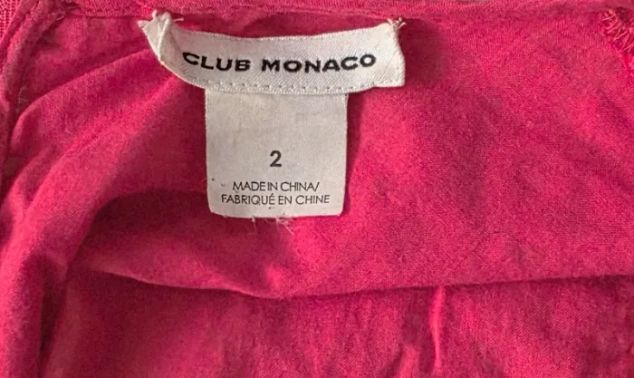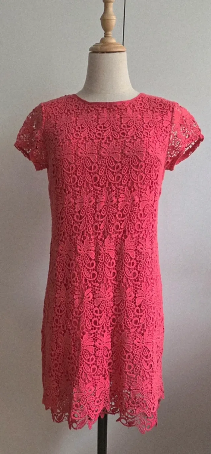 Robe de marque Club Monaco, manches courtes, taille 2, doublée, 100% coton. Couleur fuchsia, dentelle, fermeture éclair au dos. Longueur: 80cm