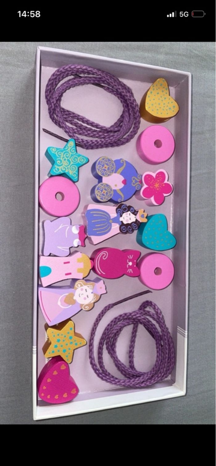 Jeu imitation collier, perle à enfiler en bois , thème princesse, bon état, 2 ans et plus, marque Djeco Manque juste une pièce petit rondins rose, au lieu d’en avoir 4 y en a que 3. Mais ne gêne en rien l’utilisation