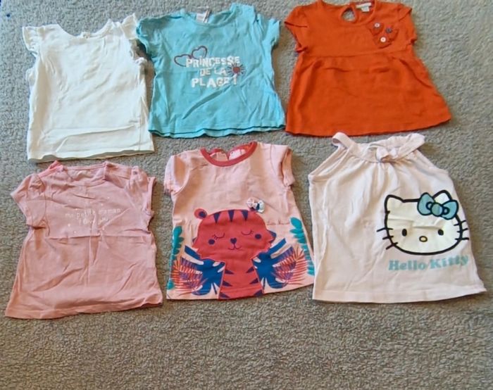 💮5 Tee-shirts manche courte 💮1 débardeur 💮 Très bon état 💮 Juste un rajout d'une pression sur un tee-shirt (voir photo) 💮 Différentes marques 💮 Possibilité de séparer le lot (1€ le tee-shirt) 💮9 mois