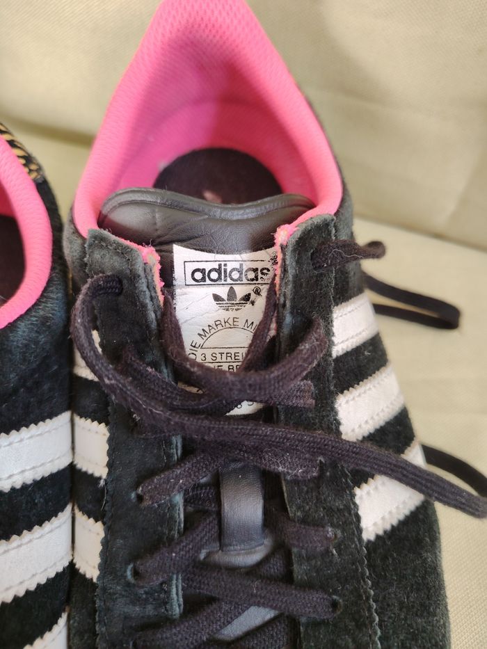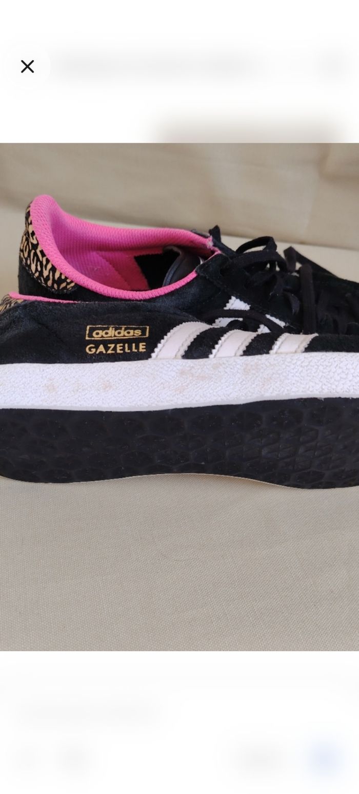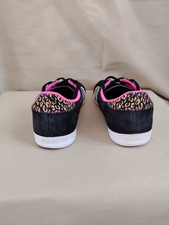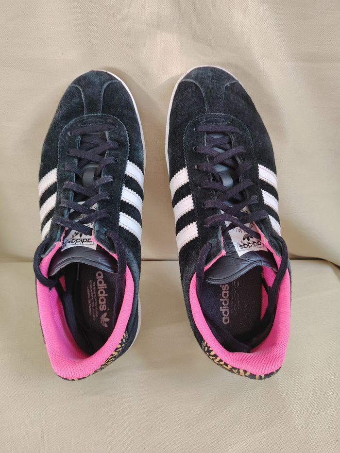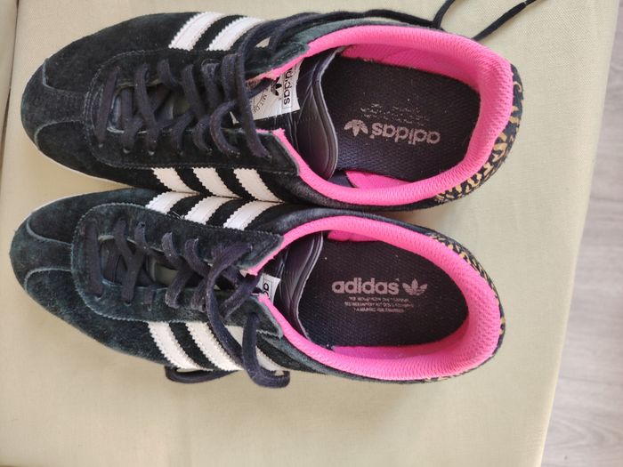 Vends paire d'Adidas Gazelle en daim noir, intérieur rose et détails léopard au talon. ​Pointure : 38. ​État : Bon état général. ​À noter : Quelques traces d'usage sur la semelle et daim avec poussière incrustée par endroits (voir photos détaillées). ​Modèle original et stylé