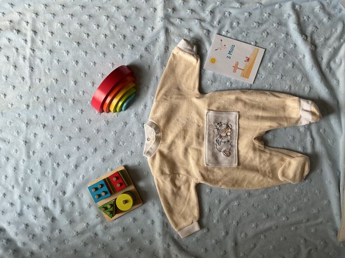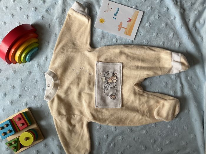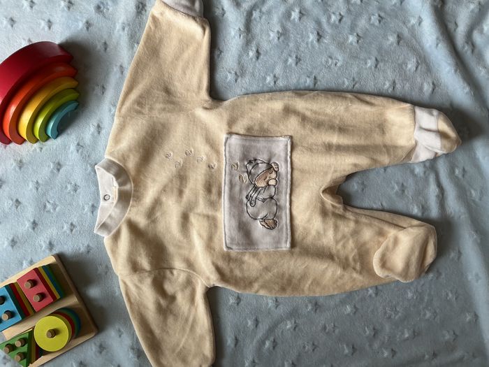 pyjama grenouillère en velours beige et blanc mixte broderie devant 3 mois - photo numéro 1