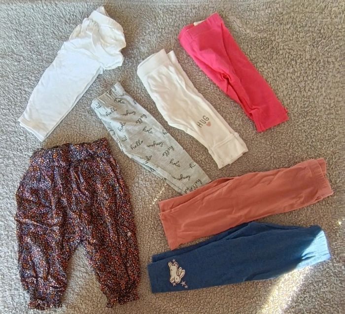 💮6 leggings 💮1 sarouel 💮9 mois 💮Très bon état 💮 Différentes marques (kitchoun, tex, little but loud, Kiabi) 💮 Possibilité de séparer le lot (1€ le legging, 1,50€ le sarouel)