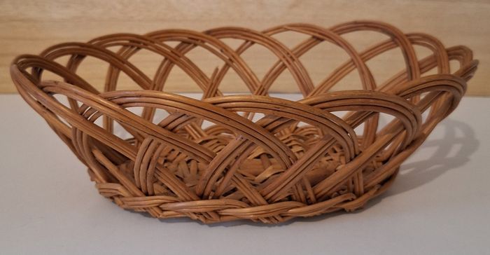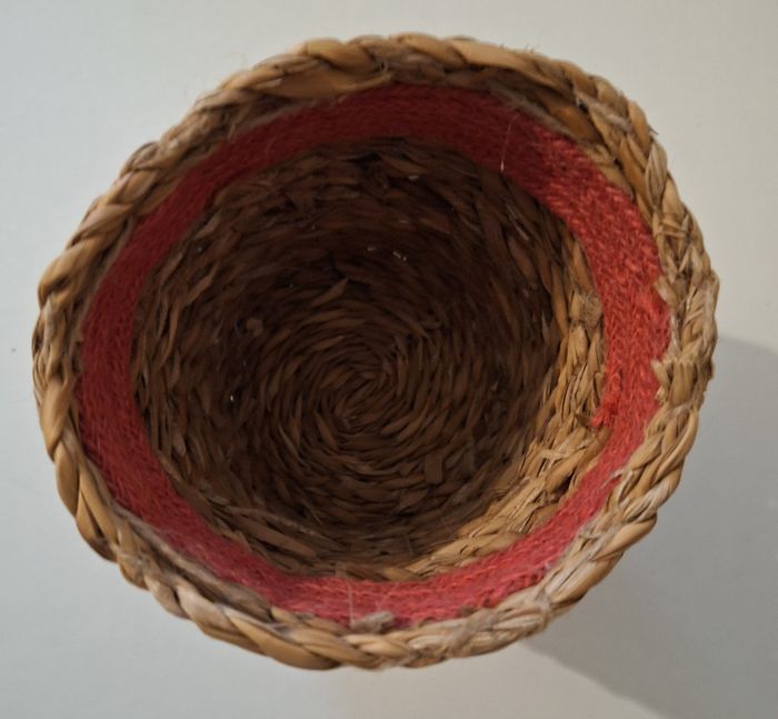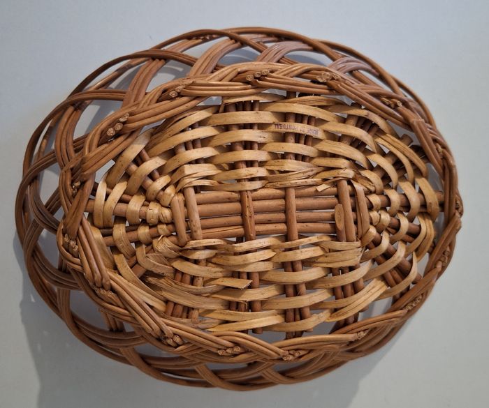 Une corbeille ovale en osier tressé de longueur 32 cm (longueur mesurée en haut de la corbeille) et de hauteur 11 cm. Il manque un petit bout d'osier, voir photo. Une corbeille ronde en corde de hauteur 12,5 cm et de diamètre 13 cm.
