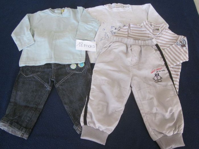 18m, jean + bas + 3 hauts ml, sucre d'orge, newman (miniman), culbuto