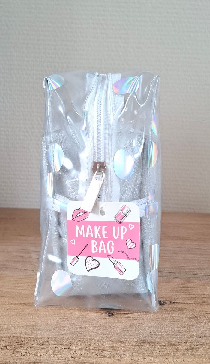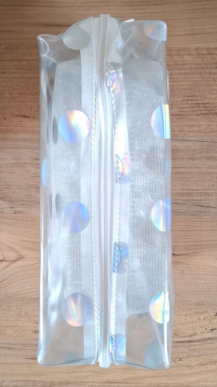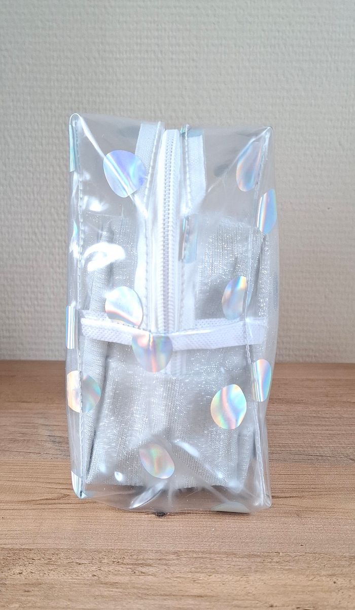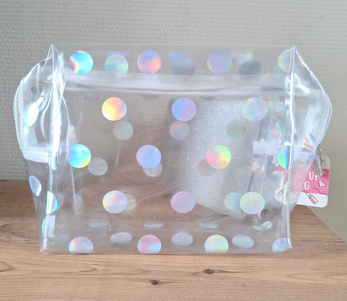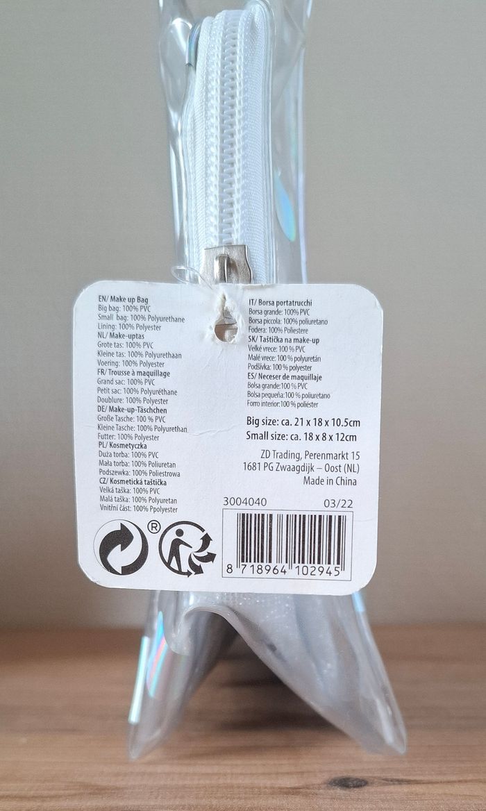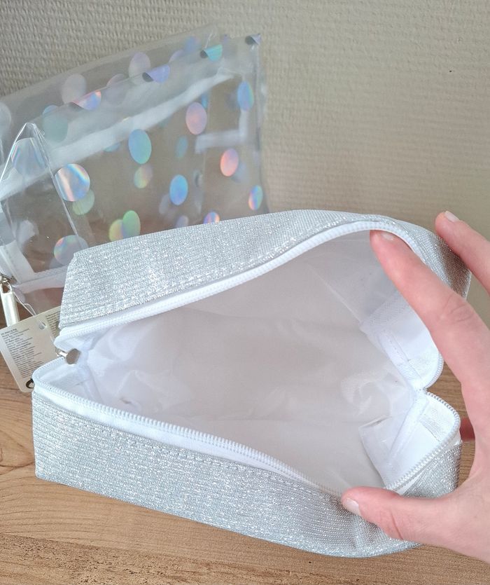 Je vends un lot de 2 trousses de maquillage venant de chez Action. Il y as une grande trousse en plastique avec des points argentés qui mesure 21 cm × 18 cm × 10,5 cm. Et une petite trousse argentée 100% polyuréthane avec une doublure 100% Polyester qui mesure 18 cm × 8 cm × 12 cm. Les deux sont neuves avec étiquette.